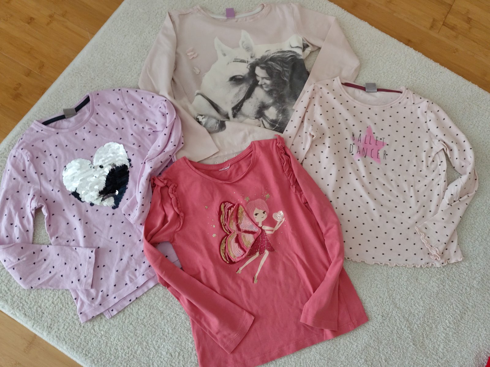Predám tričká s dlhým rukávikom pre dievčatko vo veľkosti 128, sú nosené, ale bez poškodení... modré so zlatou hviezdou s flitrami celková dĺžka od ramena po spodok - 45 cm dĺžka rukáva od krku - ...
