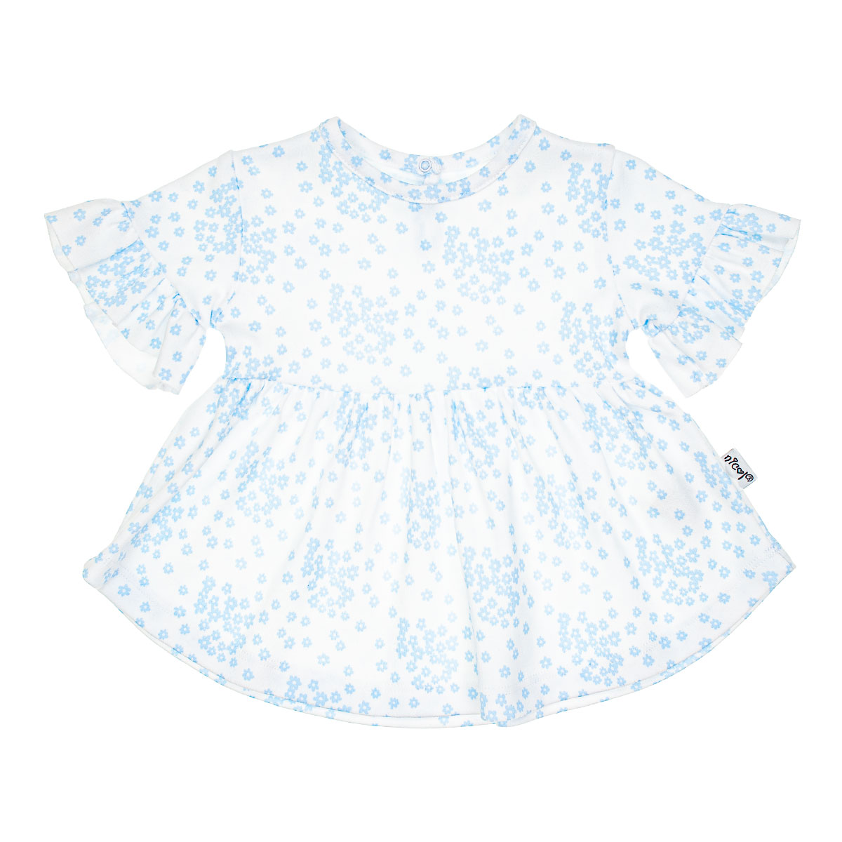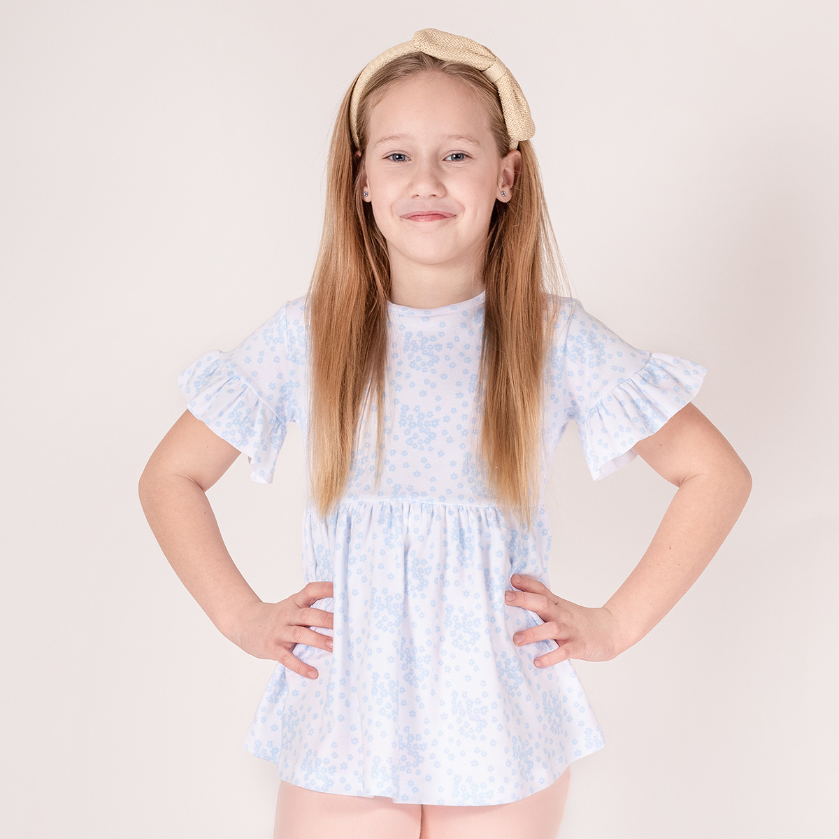 Rozkošná blúzka s krátkym rukávom ušitá z kvalitnej bielej bavlny so subtílnou modrou potlačou kvietkov. Strih krásne zvýrazní postavu vďaka jemnému prestrihnutiu v páse. Volániky na rukávoch a na spodnom leme jej dodávajú ľahkosť a dievčenský šarm.