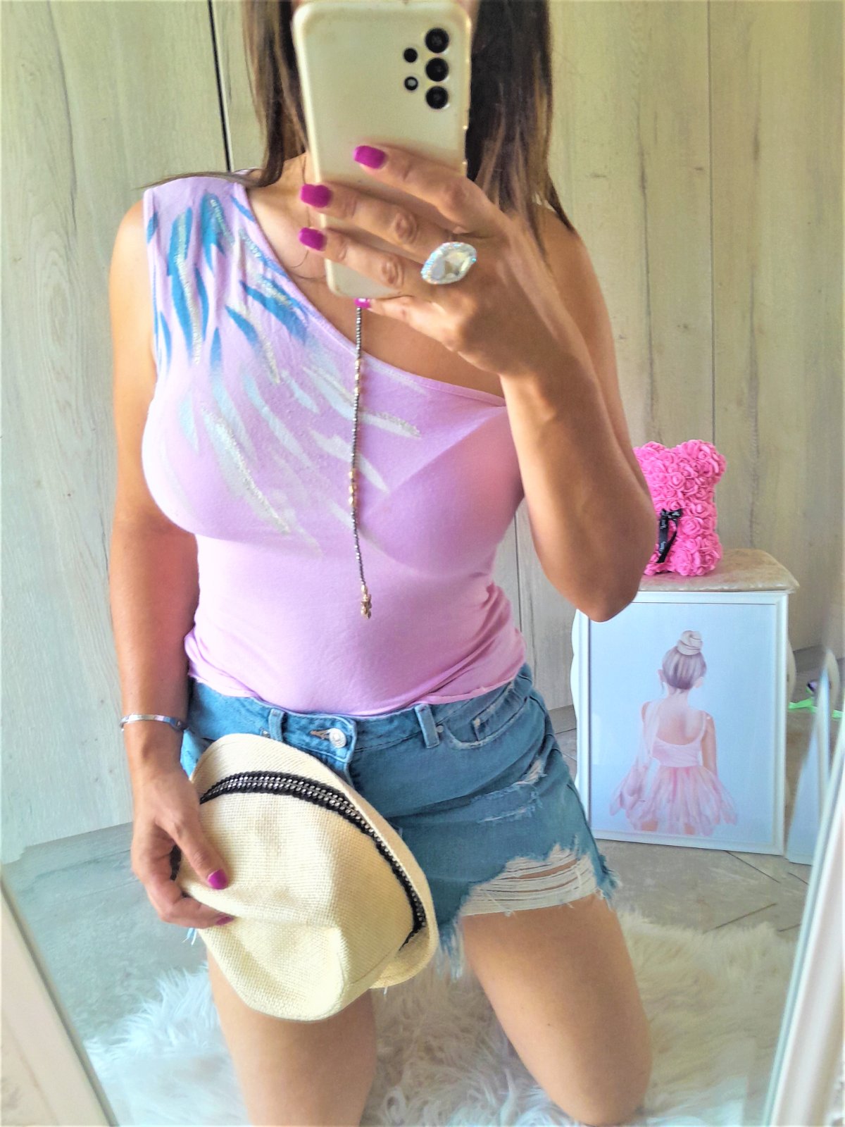 nevymieňam!!top som mala pár krát,-príjemná bavlnená látka-s efektnou potlačou na jednom ramene-dĺžka 49cm,šírka 2 x 31cm,mierne elastické..kuk aj na iné moje inzeráty