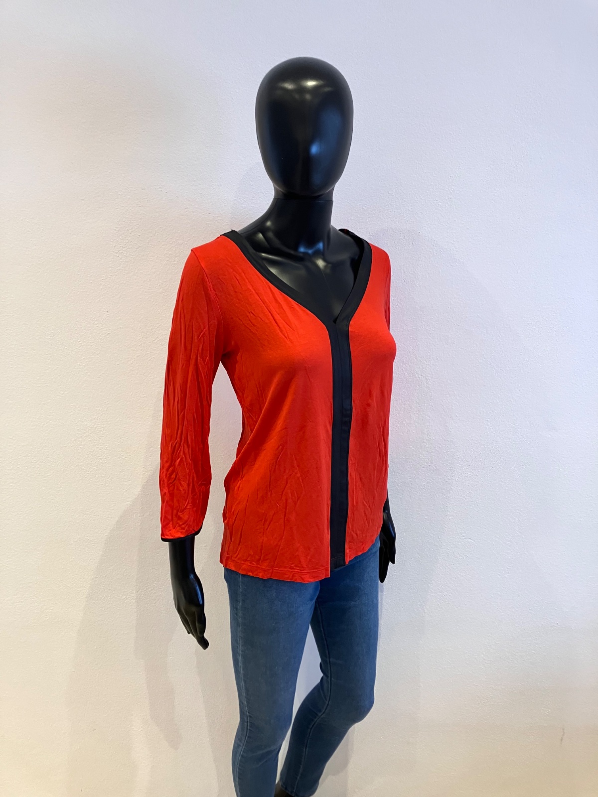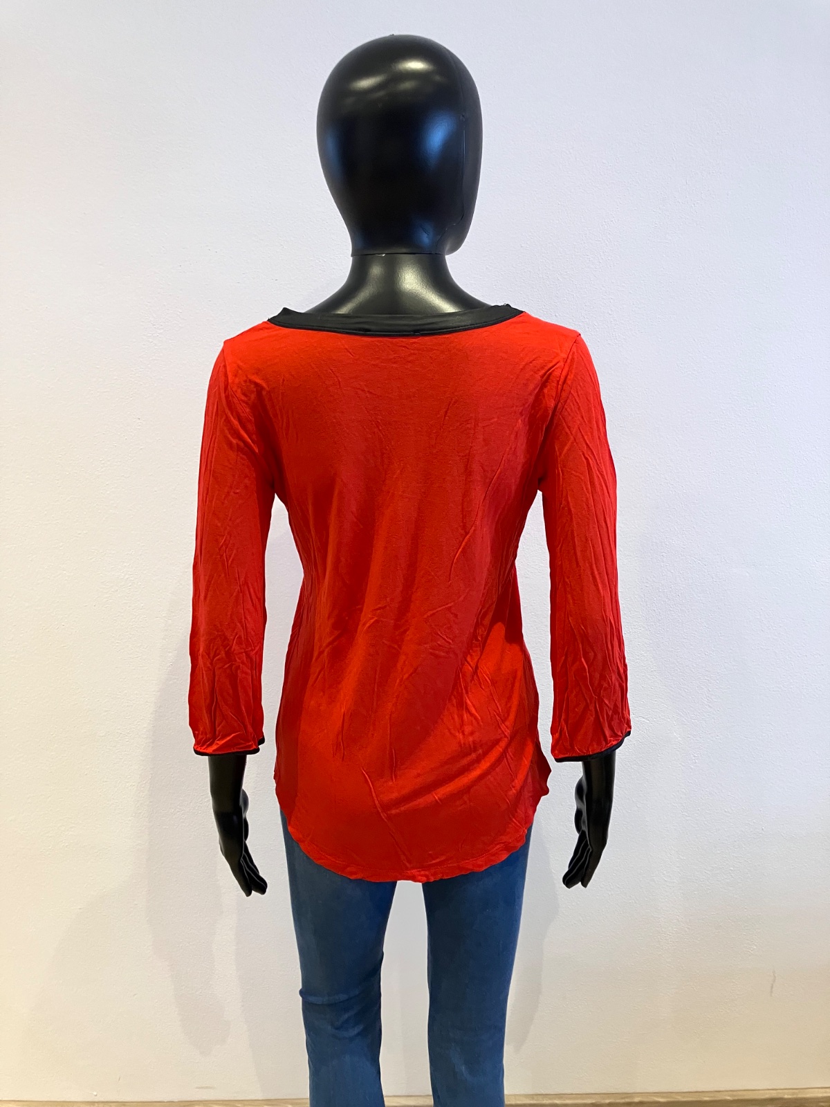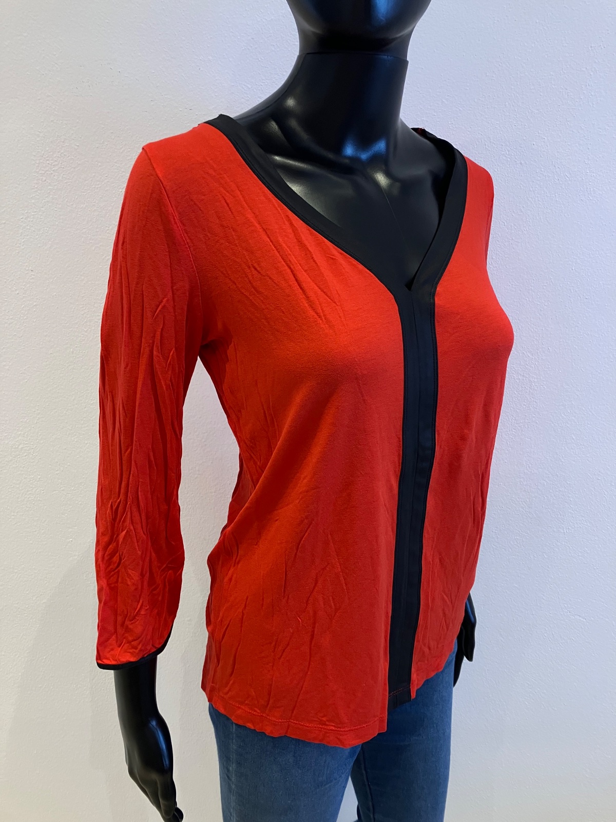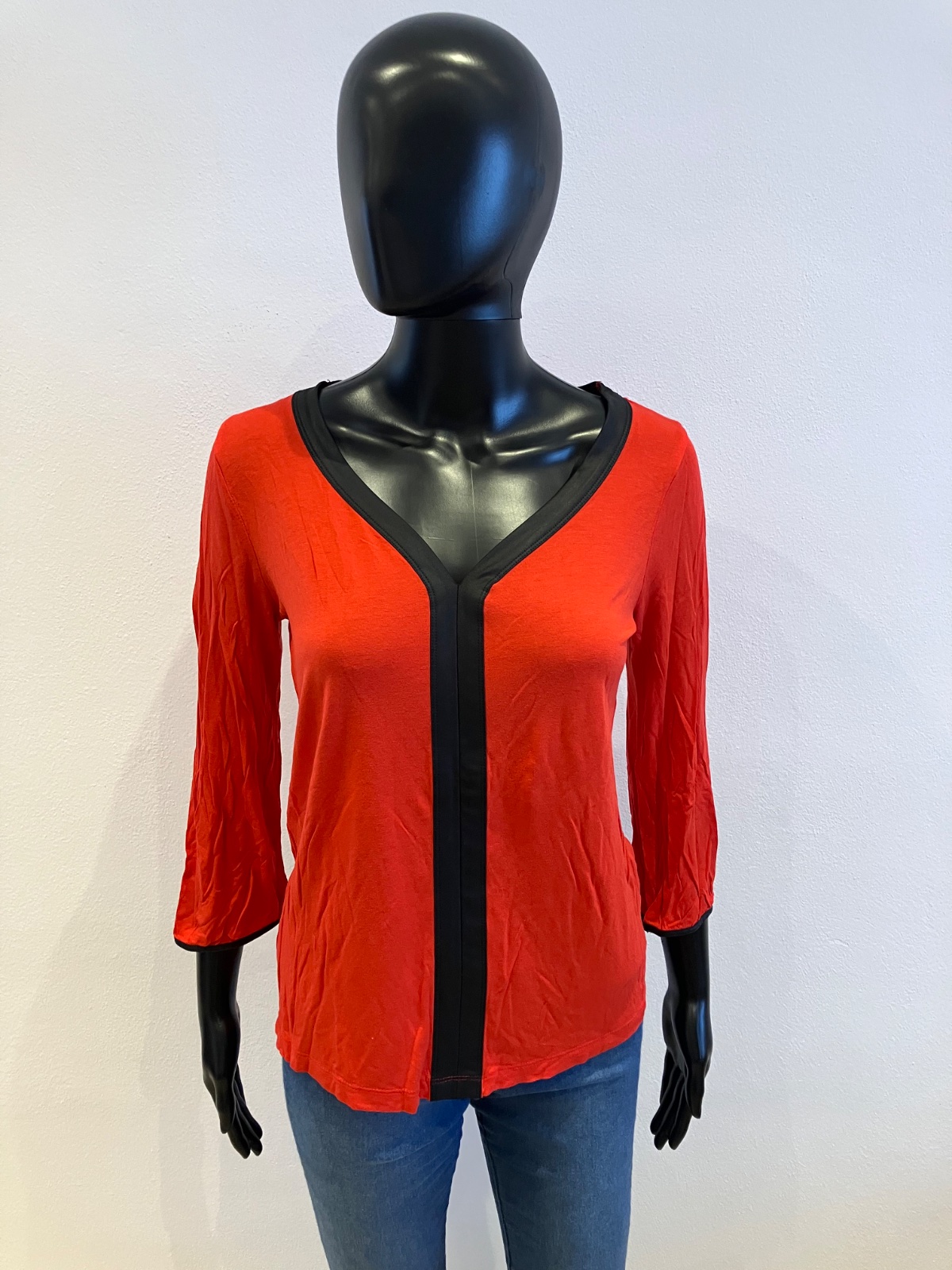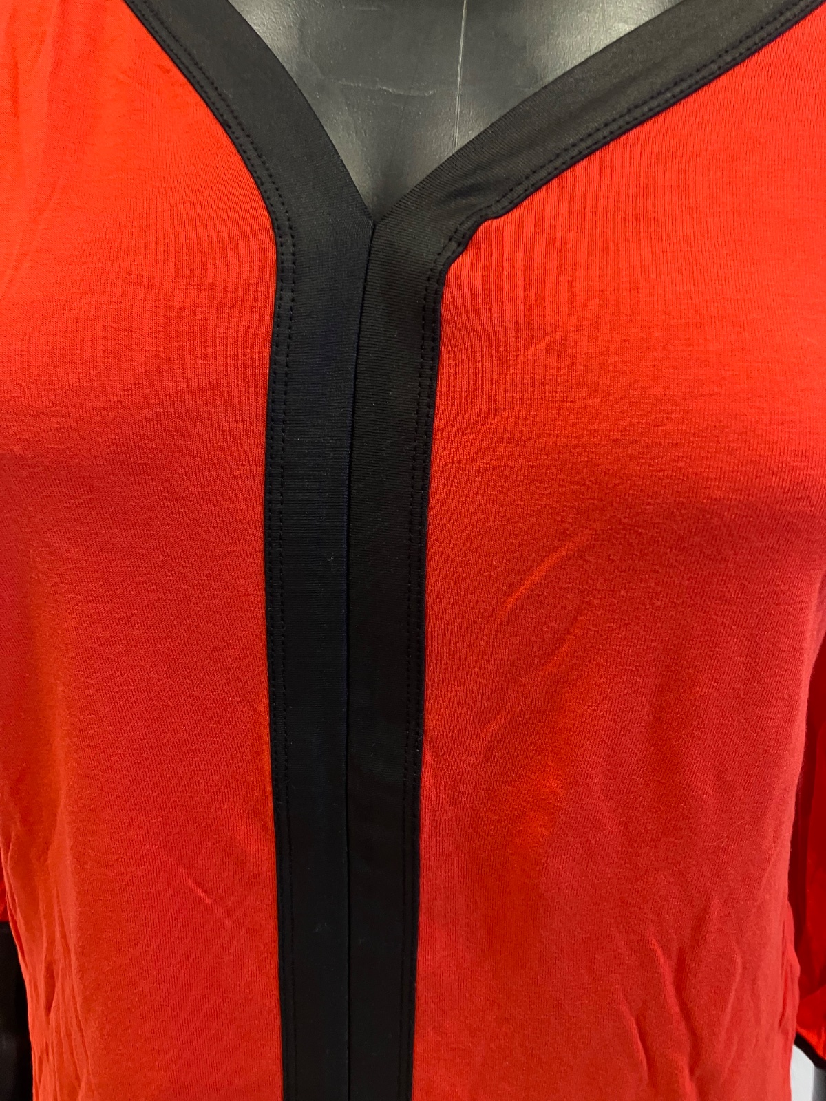 Červené tričko trojštvrťovým rukávom a s čiernym pásikom, véčkový výstrih, elastické.