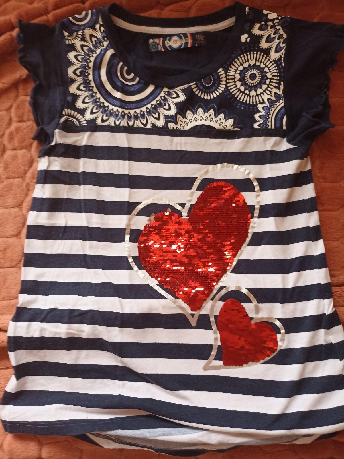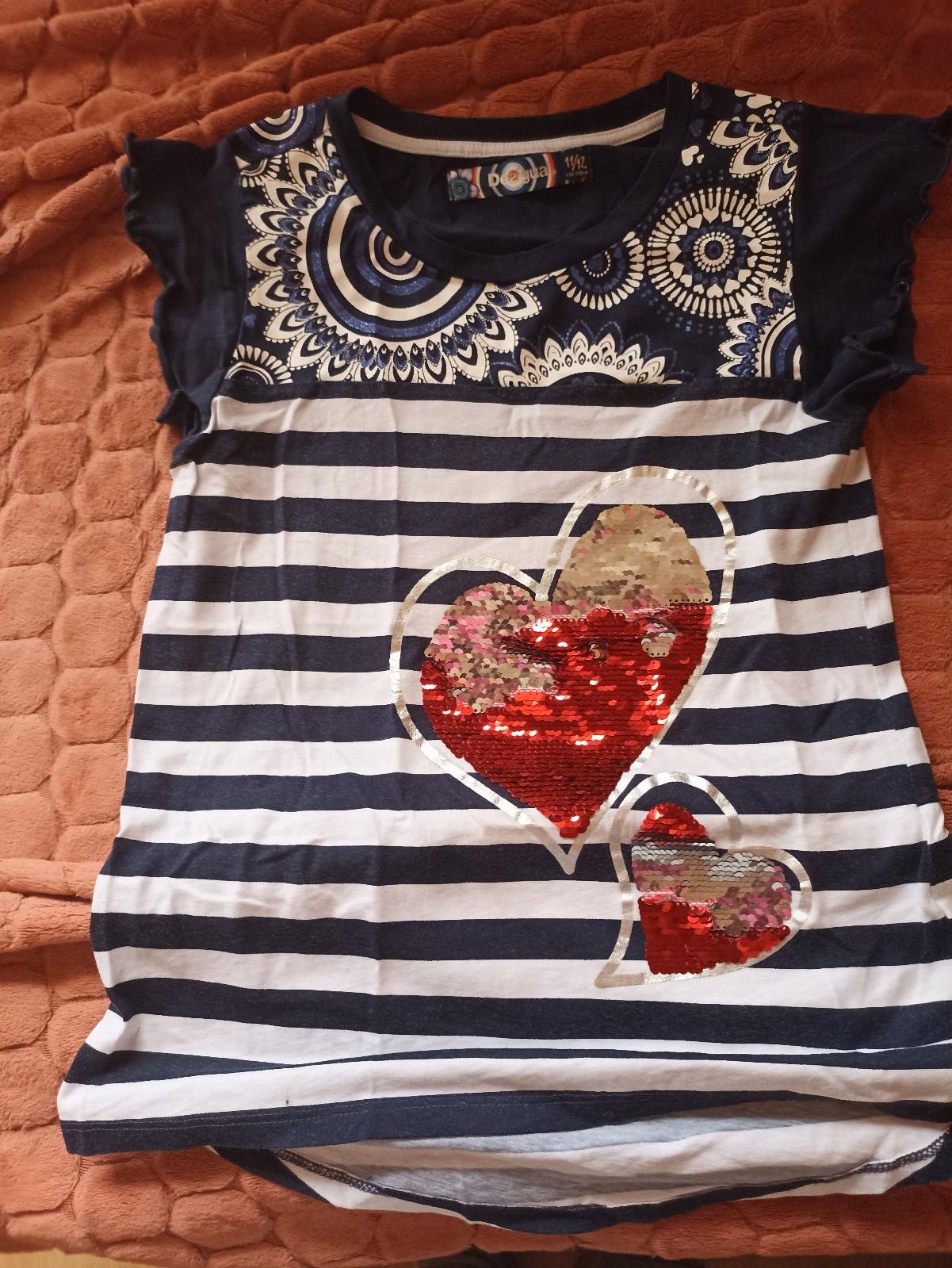 Predám dievčenské tričko s kr.rukávom, farba tmavo modrá s bielou kombináciou, pásiky a premietacia potlač, plus potlač na pleciach bielo modrá a aj vzadu na chrbte, je veľmi pekné, veľmi zachovalé, vzadu trošku predĺžené, rukáviky ozdobné, veľ. 146/152. cena 7,-€ s poštovným