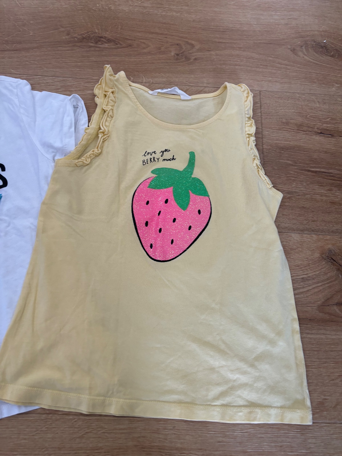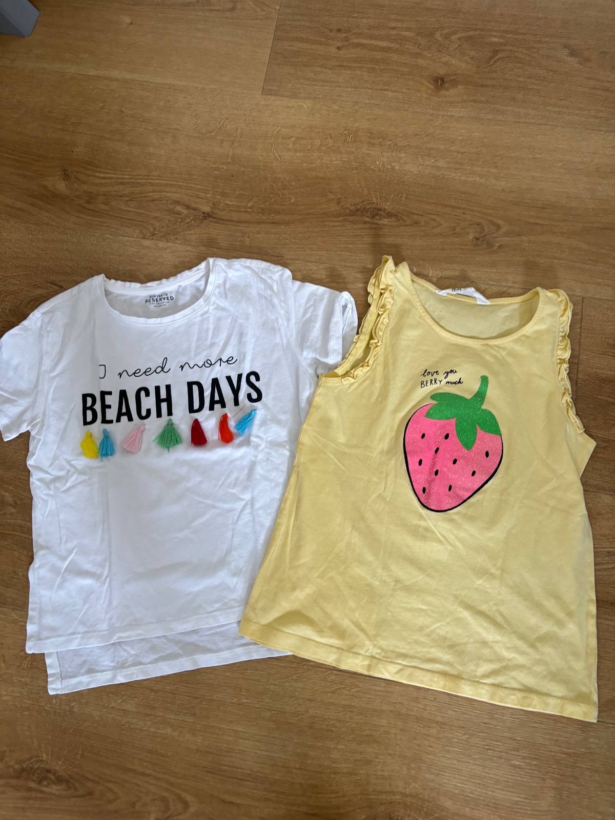 Dokonalý dovolenkový outfit. Biele s nápisom i need more beach days a žiarivými strapcami, reserved 134/ druhé tielko jahodkove 134/140. Nádherne v super stave obidvoje sadnú na 134/140. Cena spolu za 2ks.