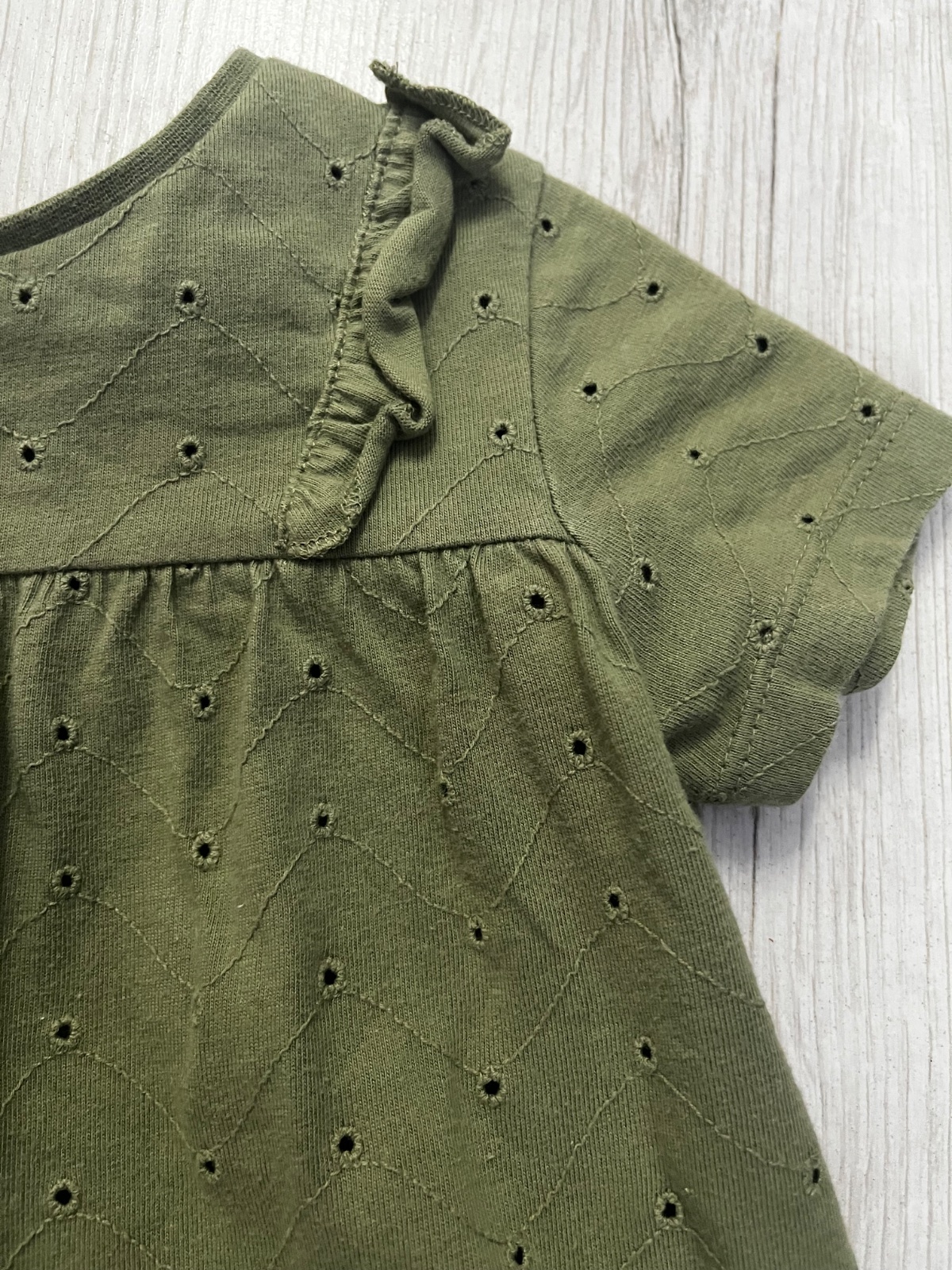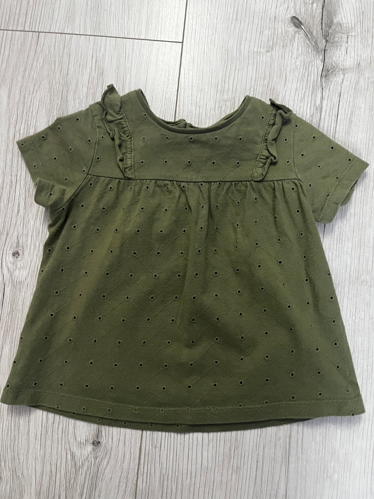 Predám kratkorukavove dierkovane tričko olivovej farby s volanmi. Značka: F&F, veľkosť: 92 (1,5-2 roky).