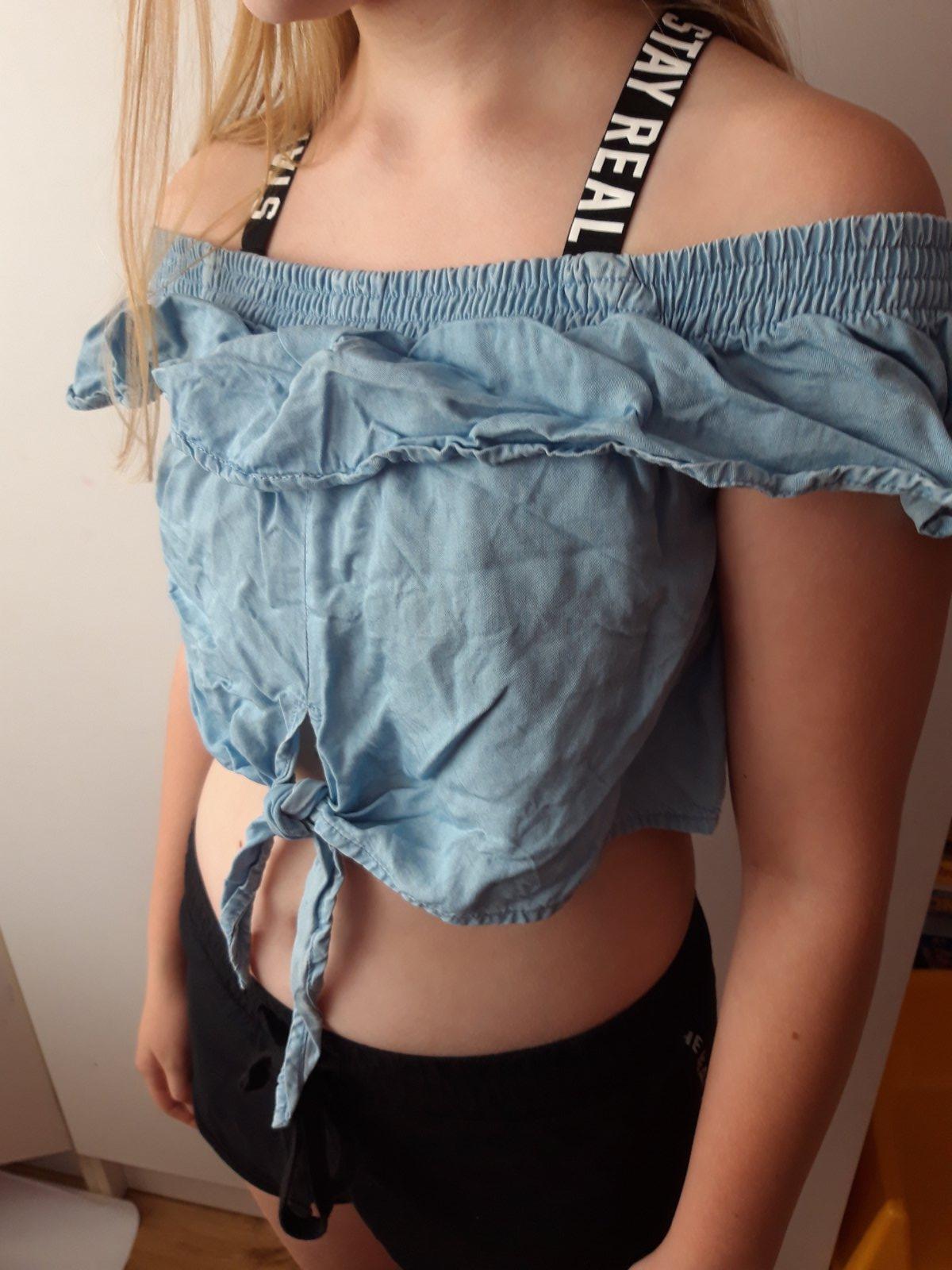 Carmen crop top (foteny na podprsenke nema ramienka) Riflovy vzhlad.makkucky tenky v.S vhodny pre stihlu babu alebo slecnu v.170 cena 4e