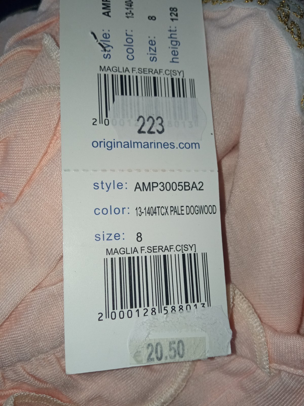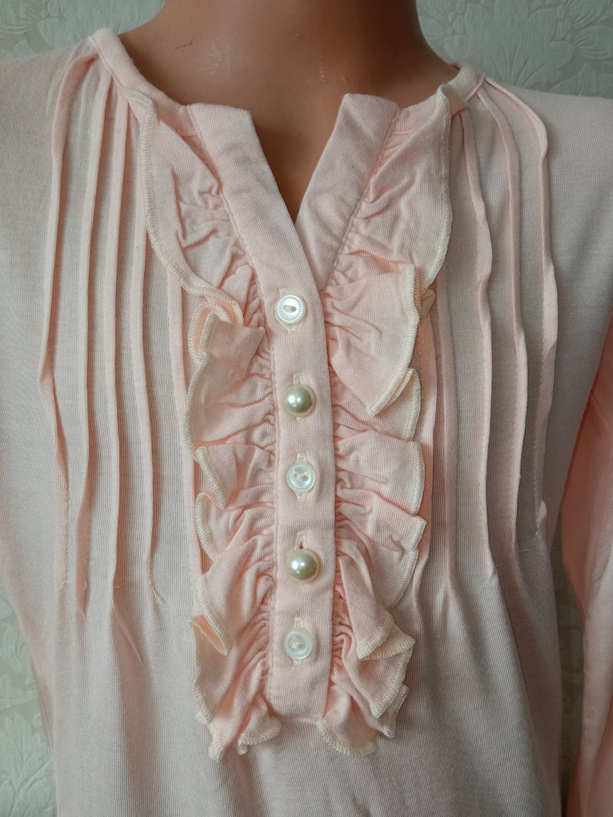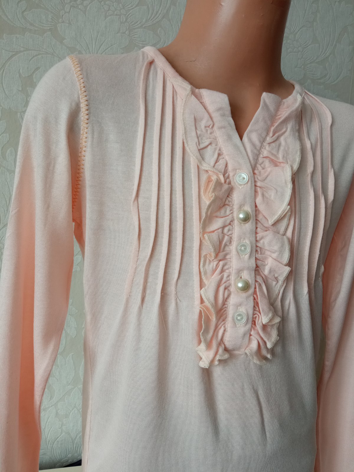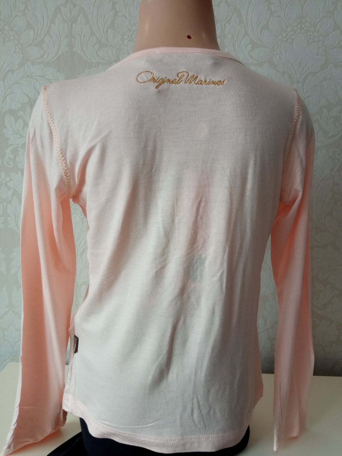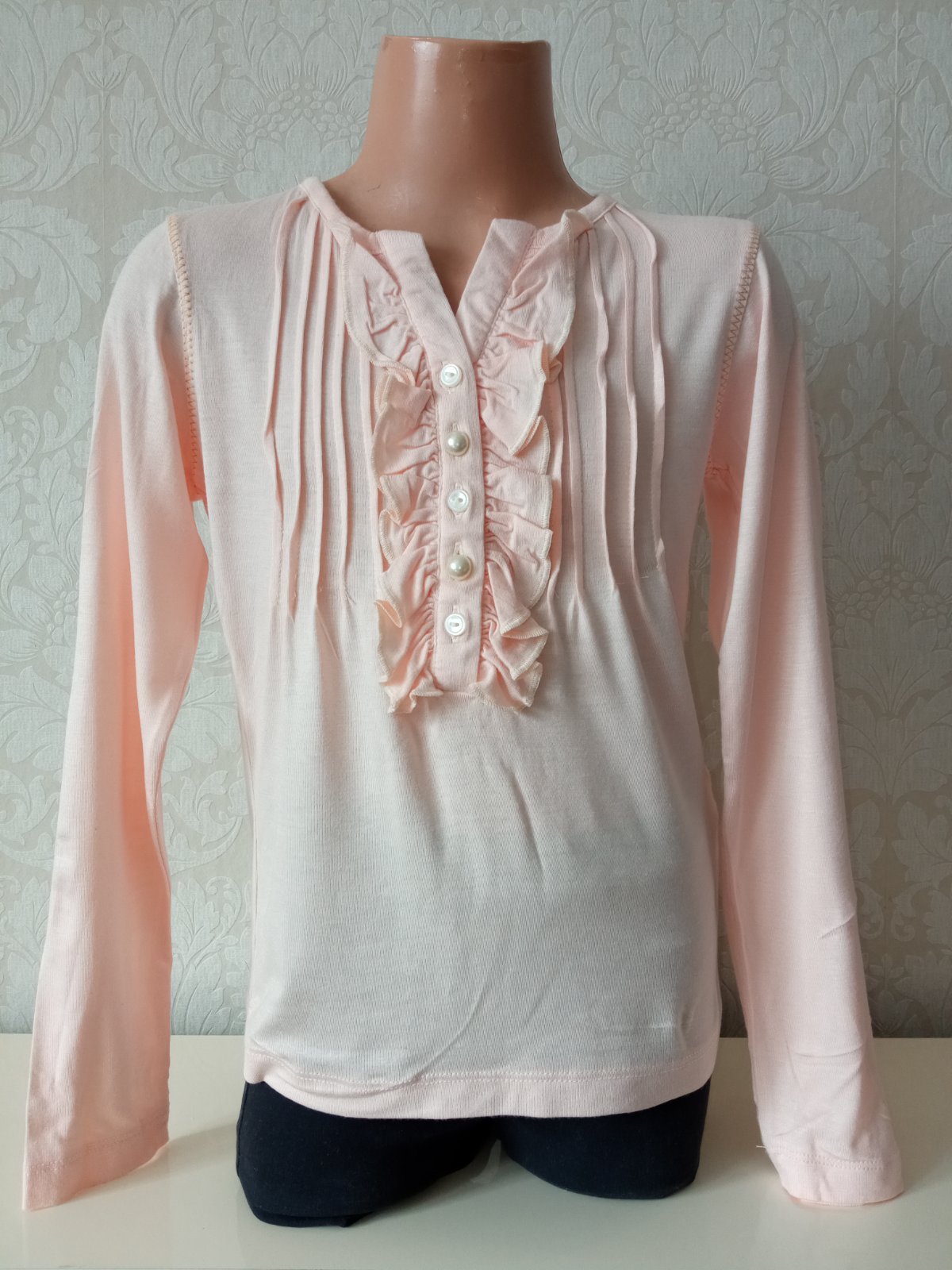 Dievčenské tričko s dlhými rukávmi a volánmi značky Original Marines, tenké, véčkový výstrih, elastické, vpredu na gombíky. Farba: broskyňová. Materiál: 96% viskóza,4%elastan