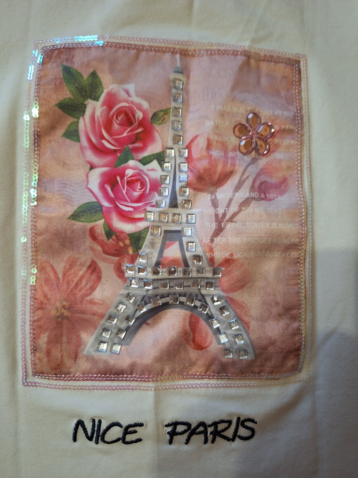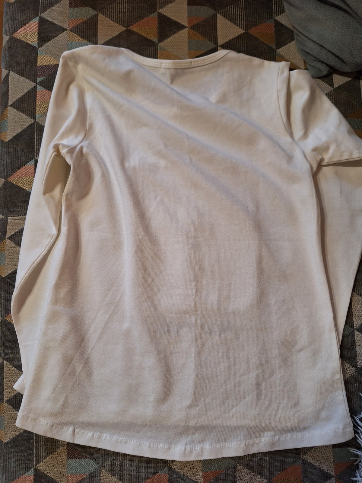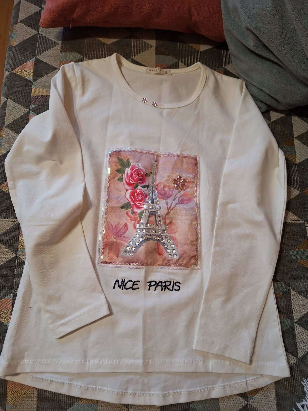 Predám dievčenské tričko s dl.rukávom bielo maslovej farby s peknou potlačou nášivkou a kamienkami - trblietkami , veľmi zachovalé, materiál príjemný mierne elastický, veľ. 140, vzadu je tričko mierne predĺžené. cena 7,-€ s poštovným