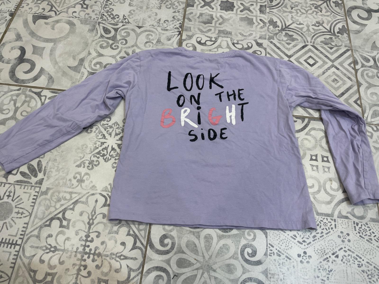 Tricko z veľmi príjemného materiálu, s aplikáciou vzadu a malou vpredu. Super stav. Veľkosť písaná 140, podľa mna skôr 134.
