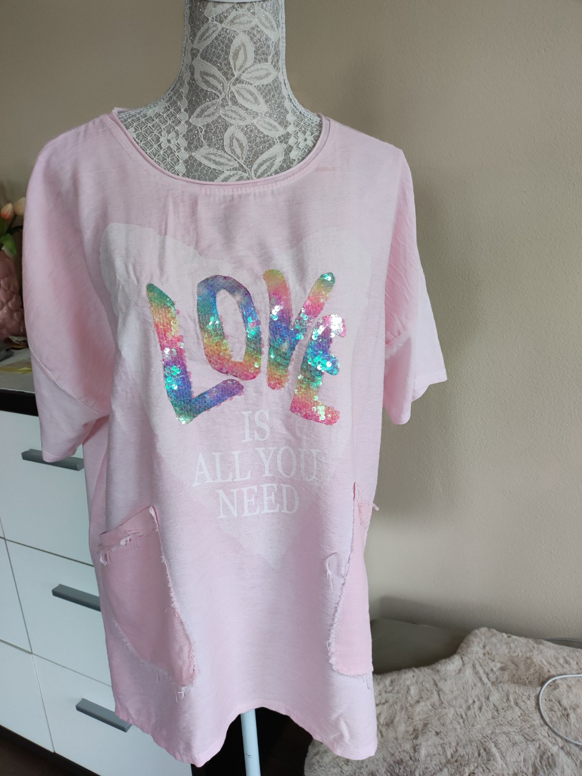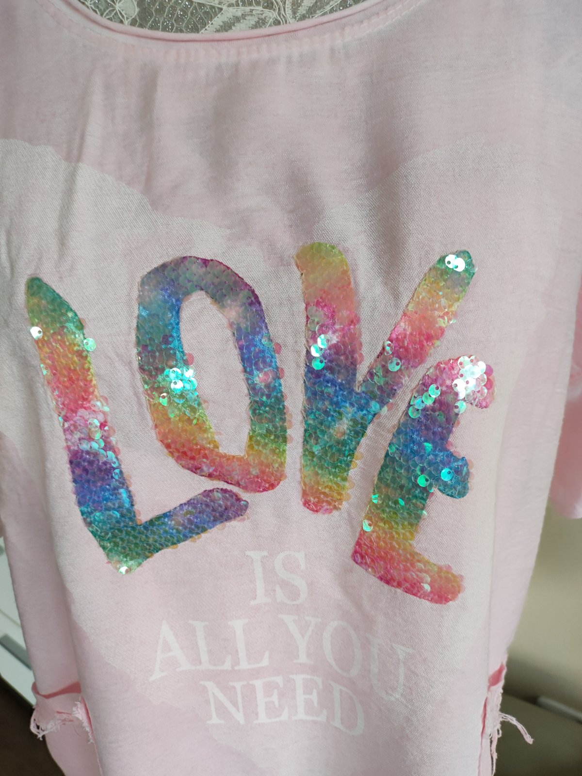 Krásne nové ľahučké bledoružové tričko "s motýlimi krídlami " so zaujímavou aplikáciou (netreba už žiadny náhrdelník) spodná časť trička je elastická - veľkosť odhadujem S - L