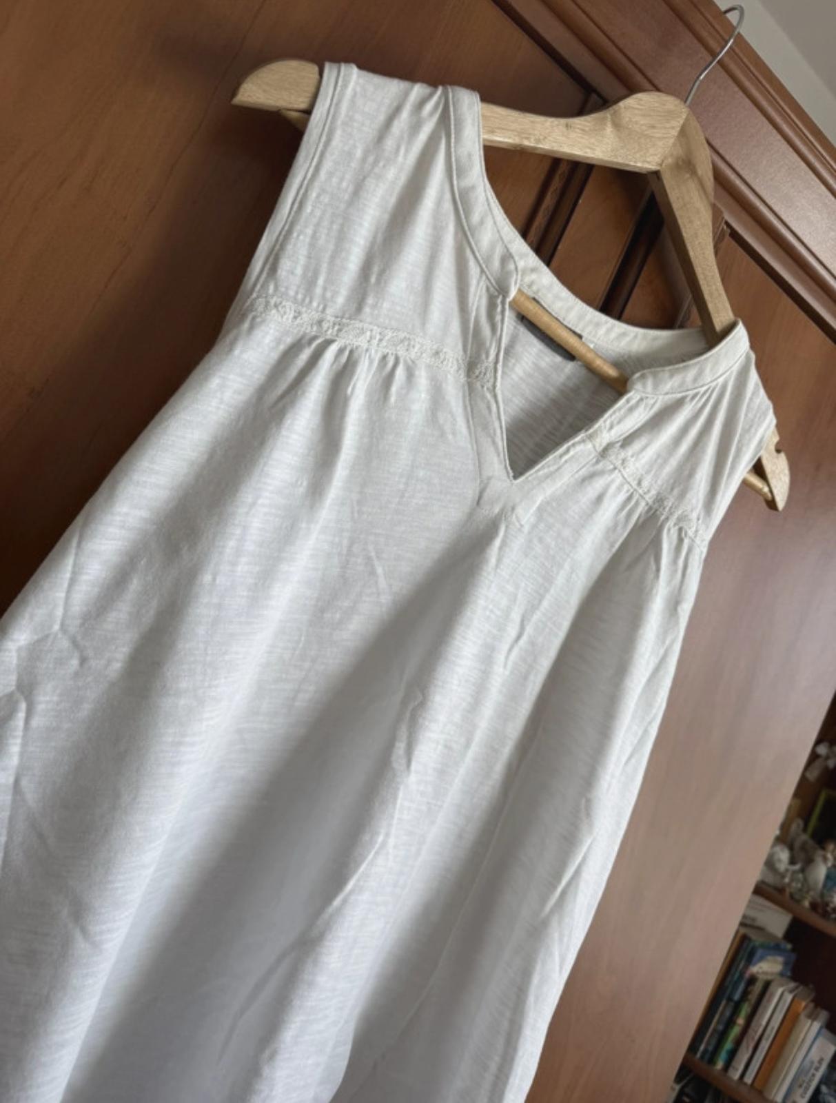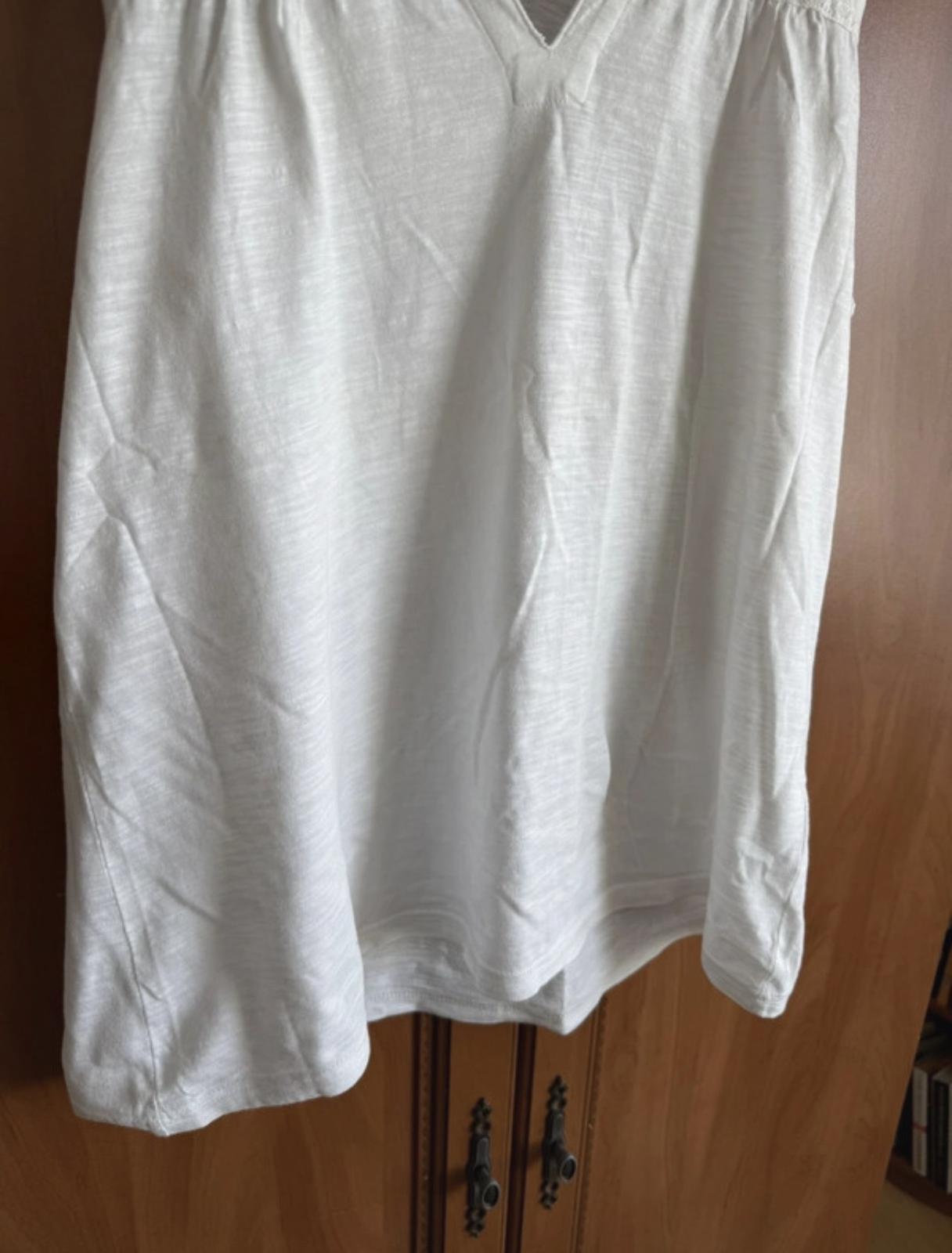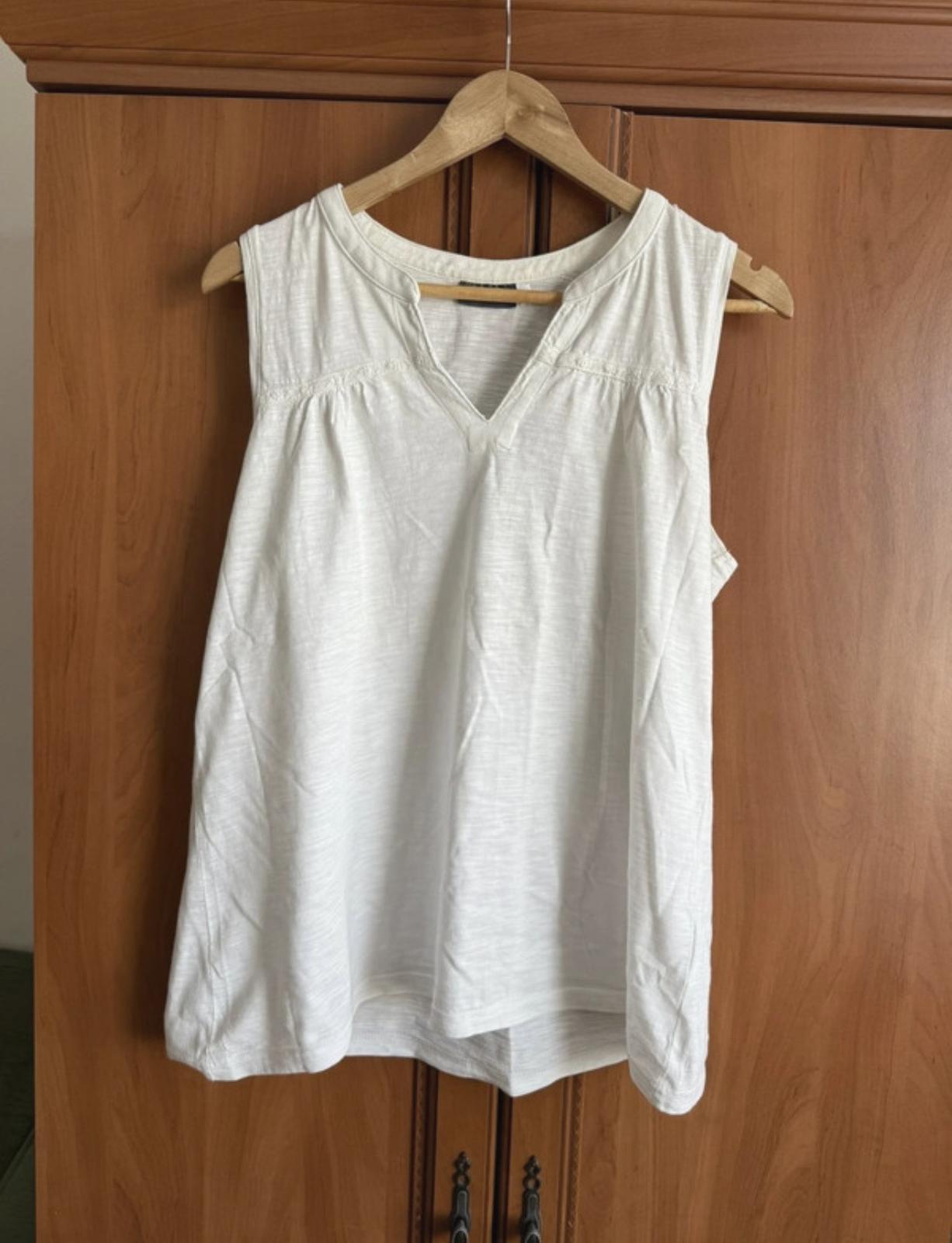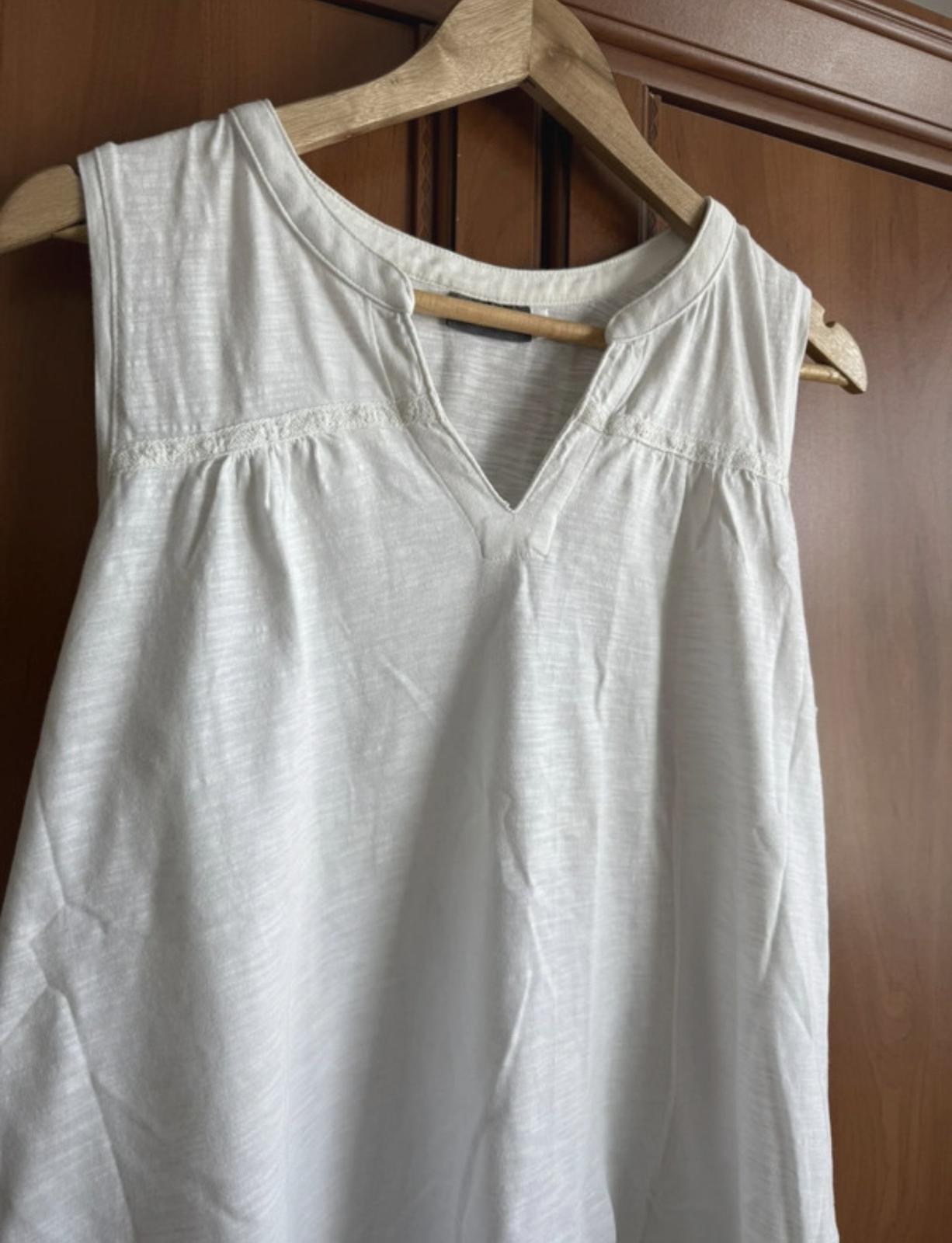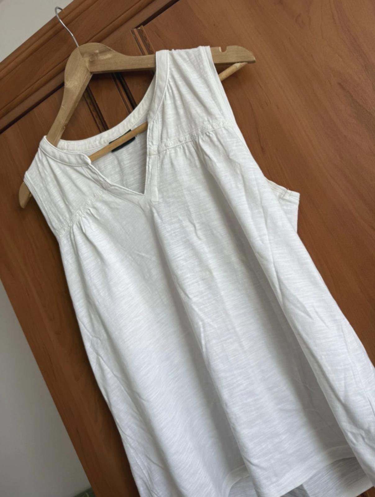 Biele tielko z príjemného materiálu, ideálne na letné dni.☀️Je veľmi ľahké, takže sa v ňom budete cítiť pohodlne a štýlovo.💐Tielko má jemný výstrih a zaujímavé detaily v hornej časti.💖Je vhodné na každodenné nosenie.🫶