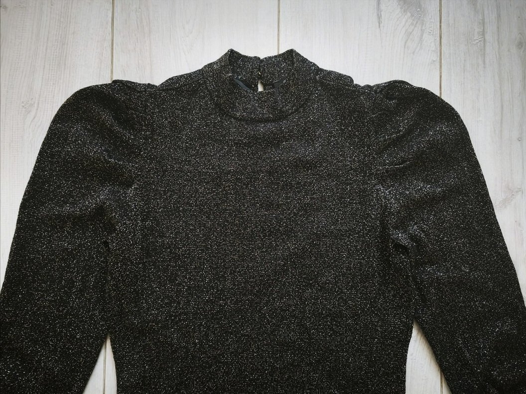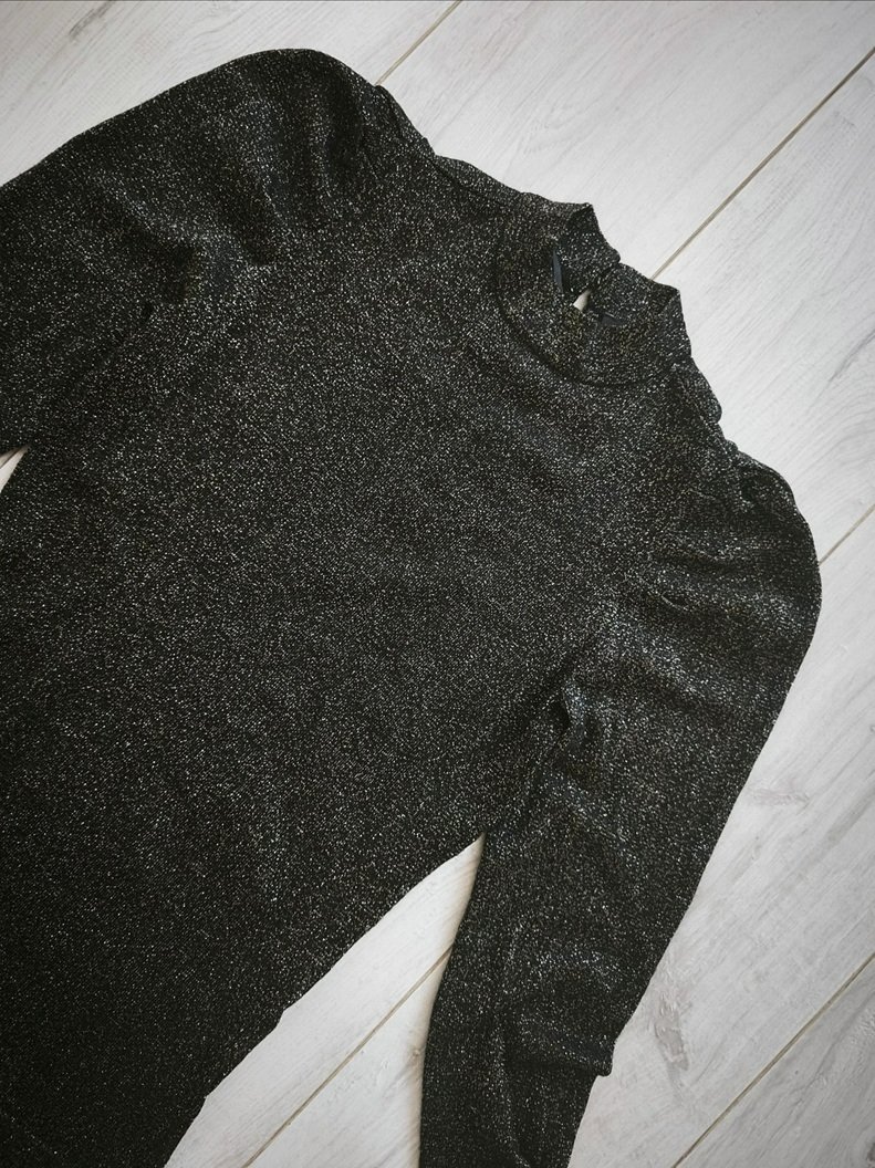 Čierny top so zlatými trblietkami zn. ORSAY, s puff efektom na ramenách a riasením na konci rukávov. Elastický, v perfektnom stave ako nový.