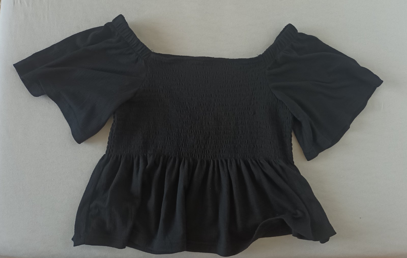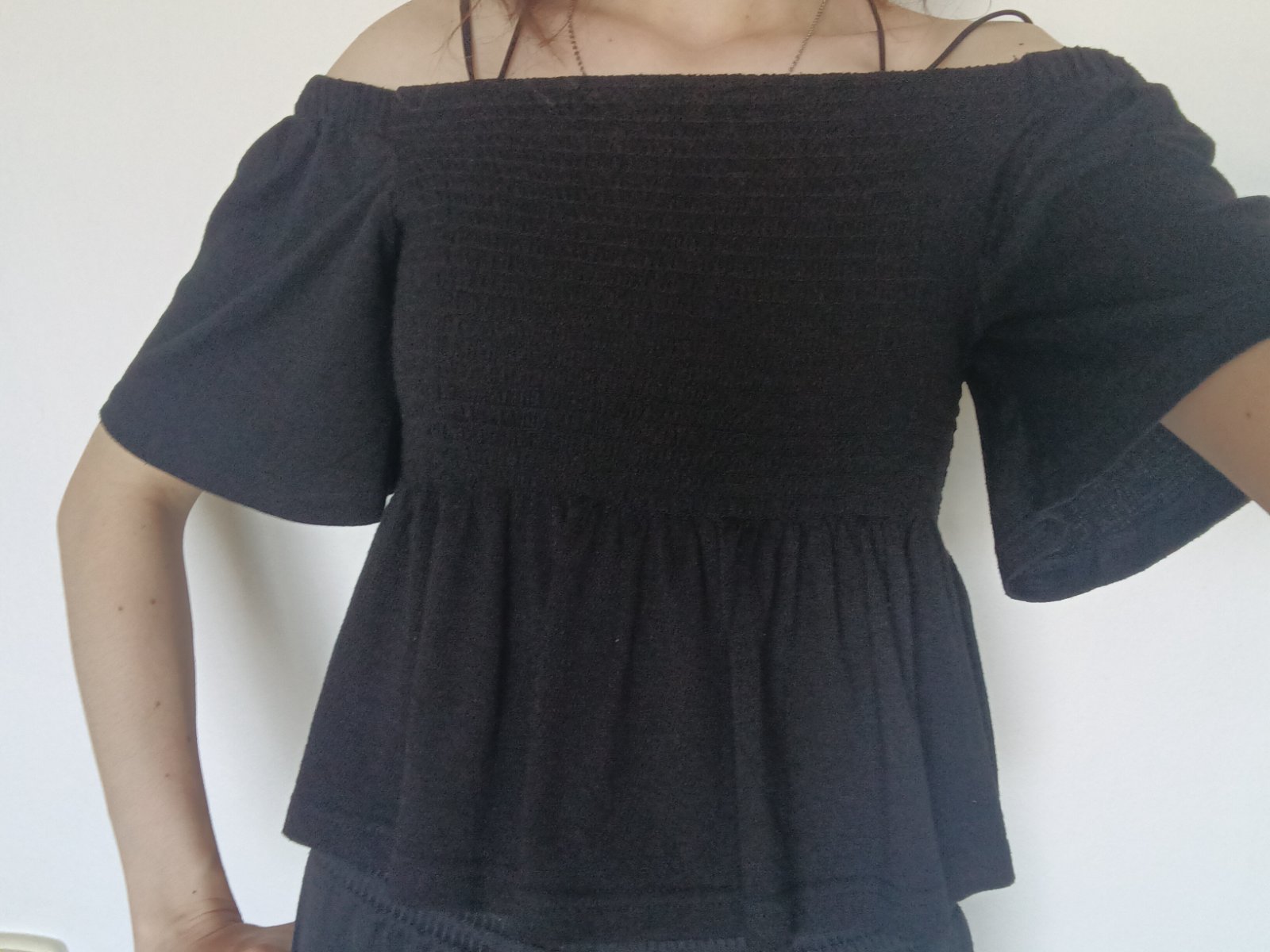 Prešívaný gumičkovou niťou, takže na hrudi priliehavý, dole je volán, rukávy taktiež širšie, hore na gumičku.