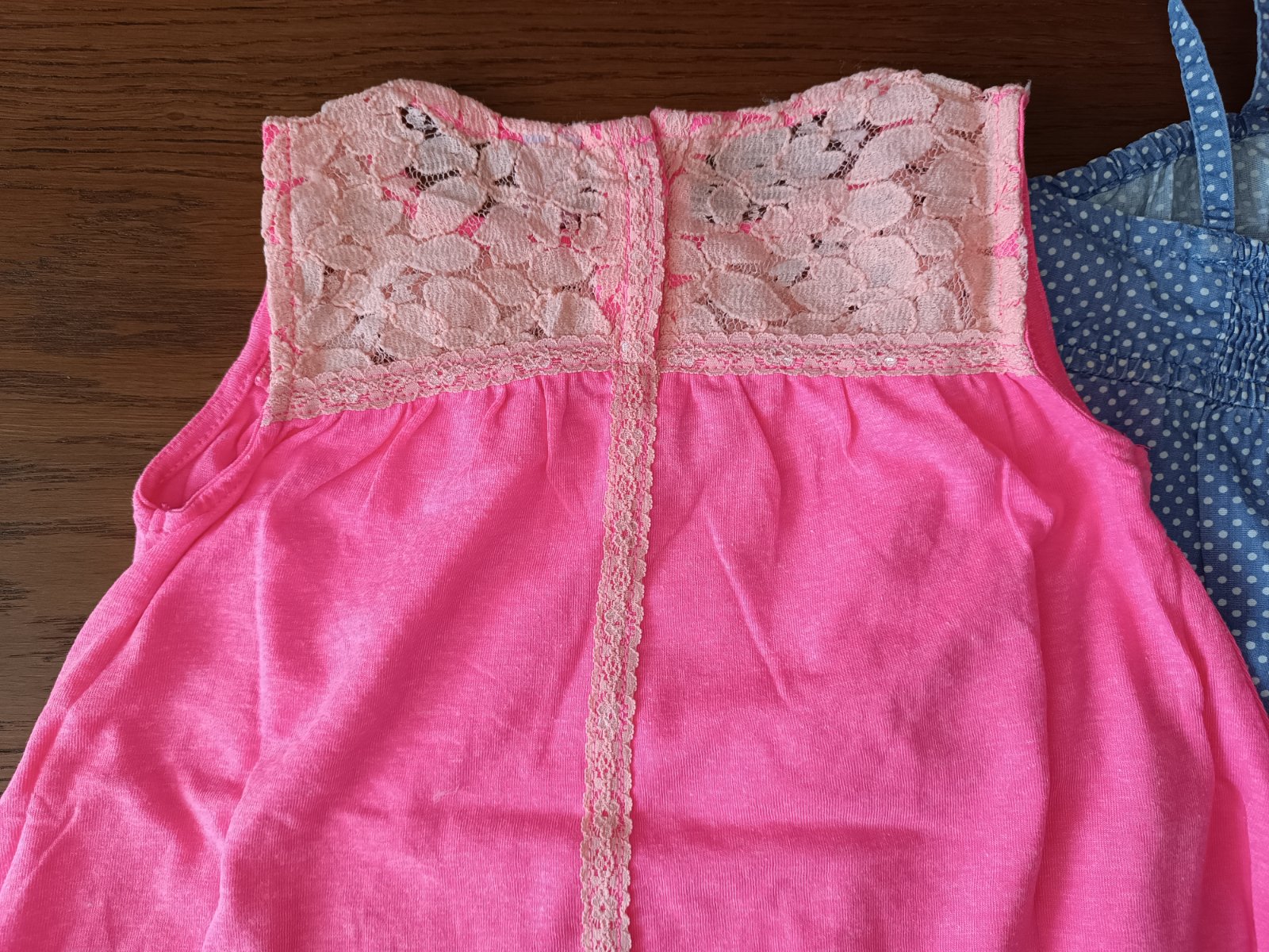 - na striedačku nosenú ružovú tuniku/tričko s krajkou, značka Dopodopo. Bežný nosený stav, poškodenia som nenašla. Cena 1,40eur.