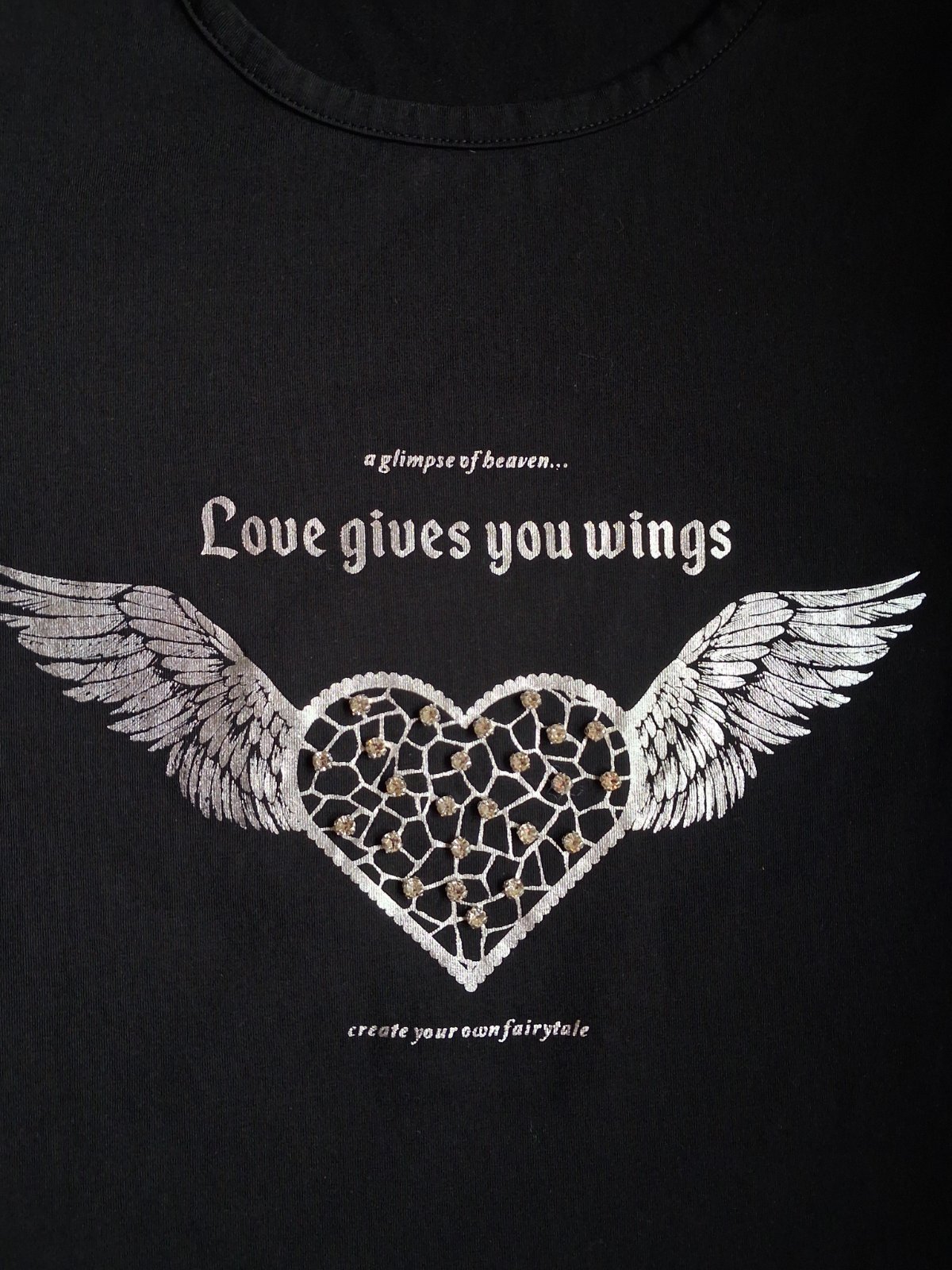 Oblečené raz na príležitosti. Takže top stav. Tričko je čierne a v predu je zlata aplikácia. Je voľnejšieho strihu. Dĺžka je 57 cm a šírka cez prsia 45 cm.