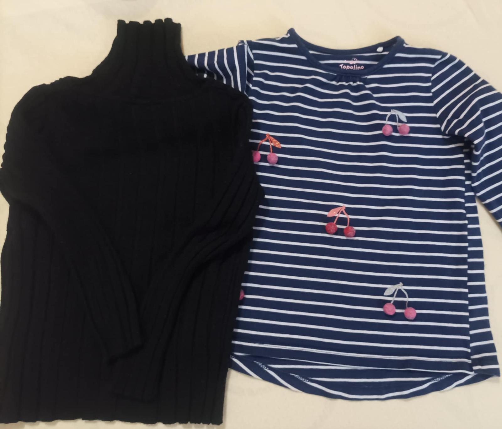 Predám tmavomodre tričko zn, Topolino s bielymi pásikami a našitými jahodkami a čierny štrikovaný roláčik.
