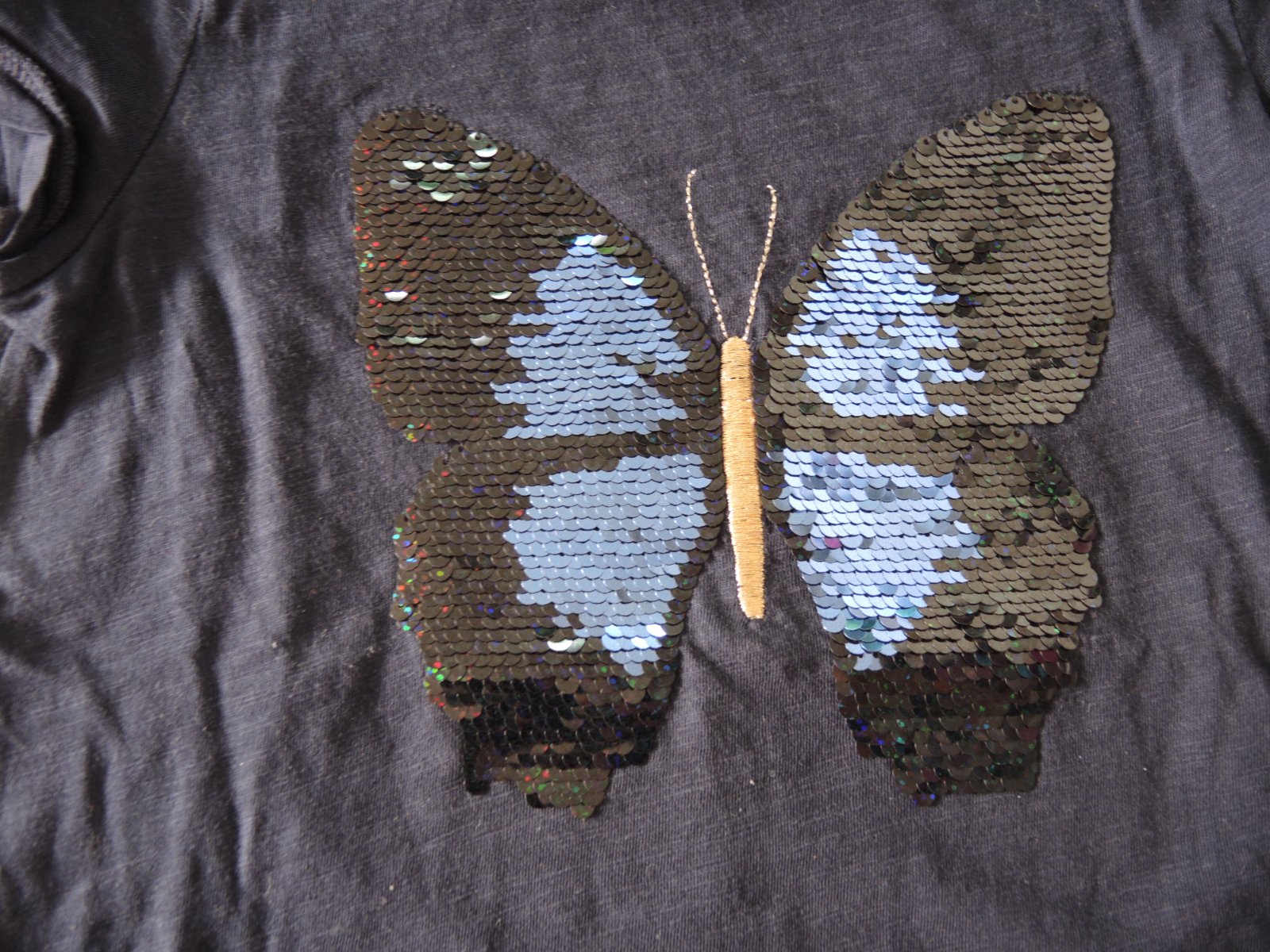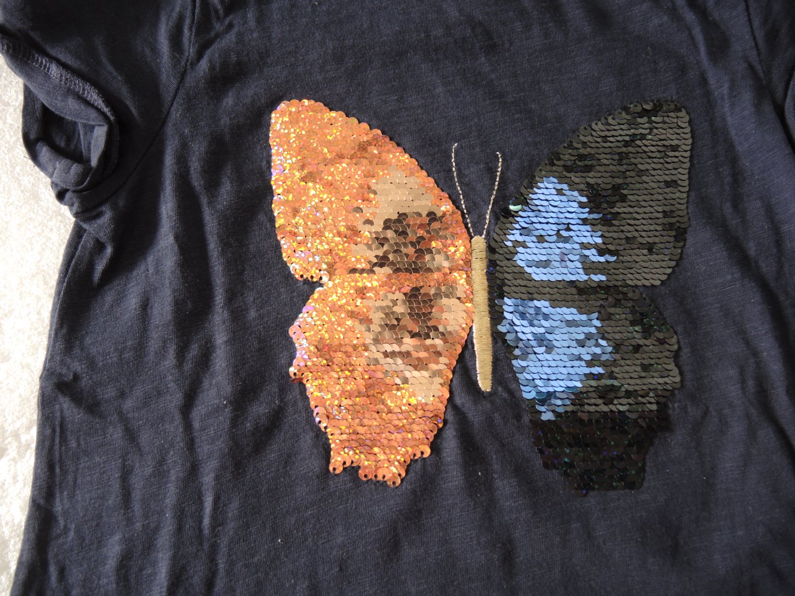 Predám krásne tričenko s flitrovým motýľom. Flitre sa dajú pretáčať. Z jednej strany je motýľ modrý, z druhej strany je zlatý. Mali sme ho len 2-3x max, ale je v top stave. Žiadne žmolky, či iné poškodenia. Dĺžka prednej strany je 47, vzadu je ešte o 2 cm predĺžené. Šírka je 34 cm.