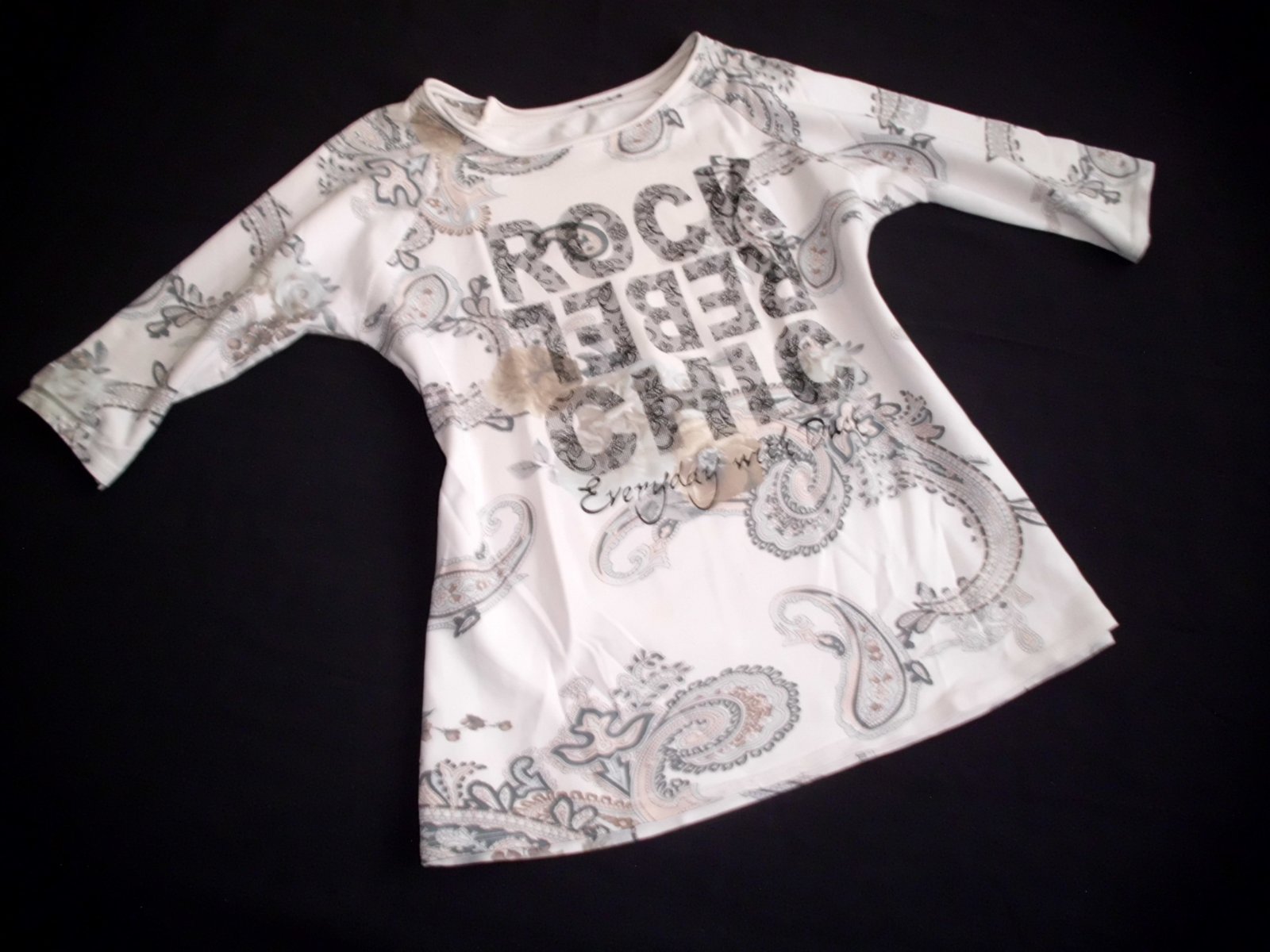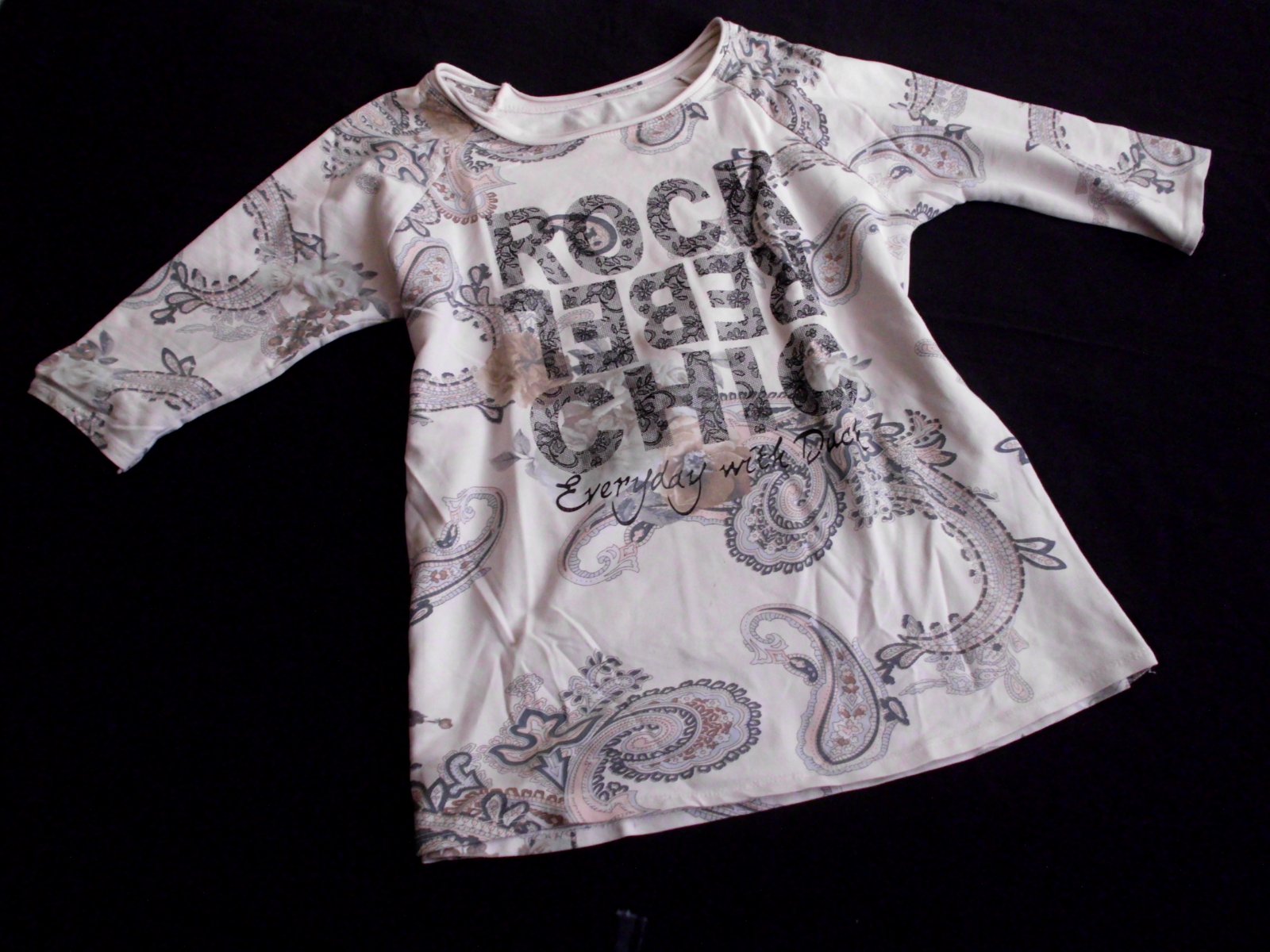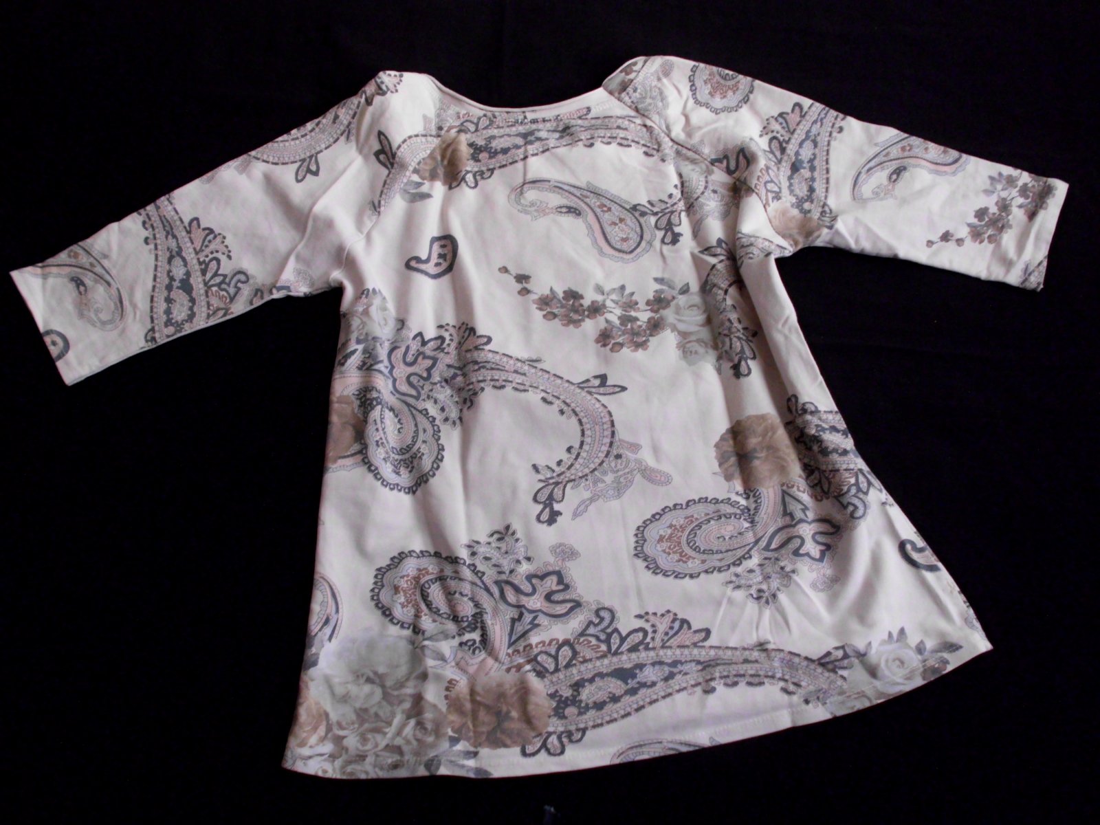 Predám dámske mikino-tričko vel. L aj na M, šírka 54cm, dľžka 70 cm, rukáv od krku 47 cm, príjemný stredne hrubý materiál, béžový podklad + modro-hnedý vzor , super stav