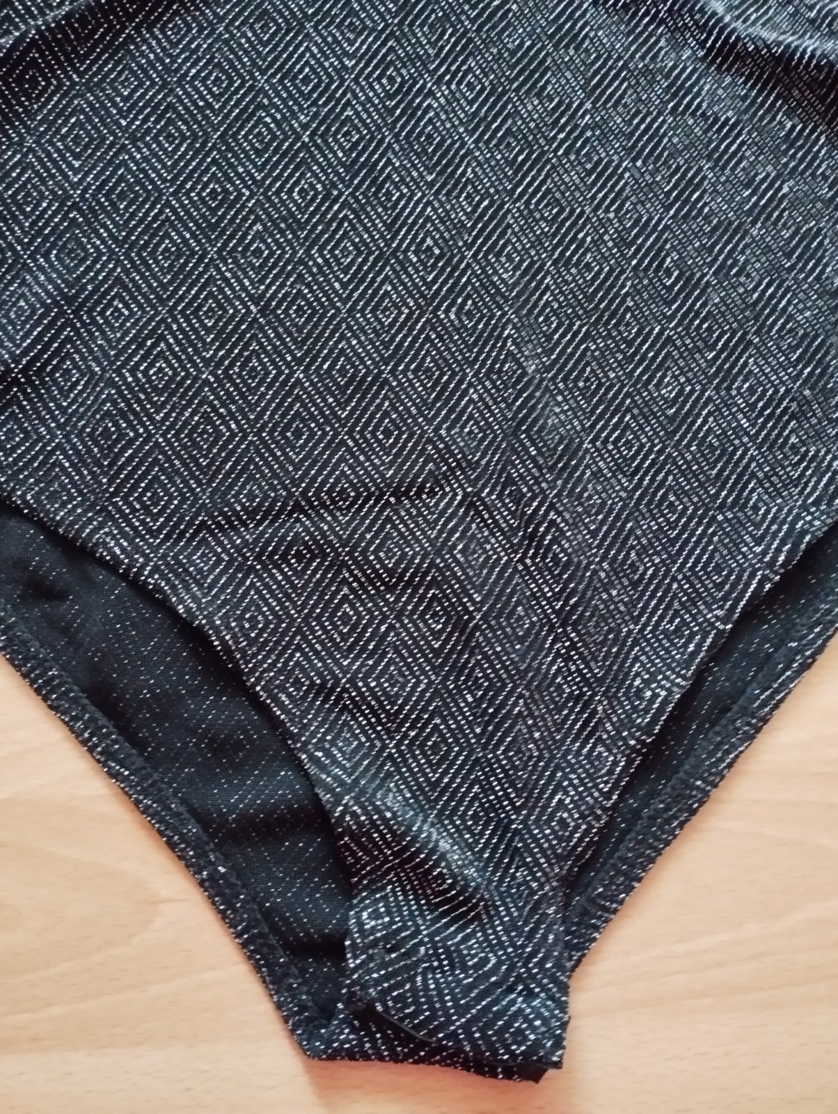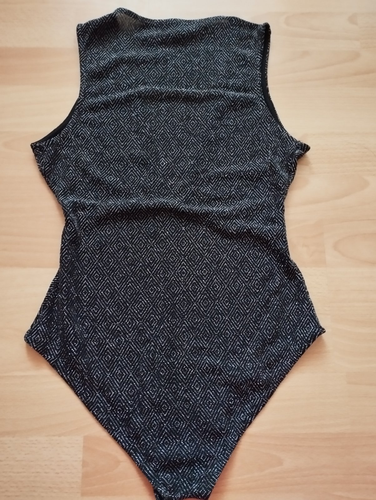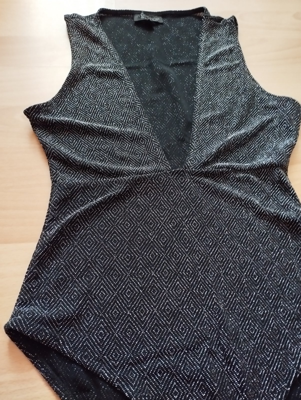 Čierno strieborné ligotavé body s hlbokým výstrihom. Raz oblečené. Dĺžka 64cm, šírka cez prsia 37x2cm.