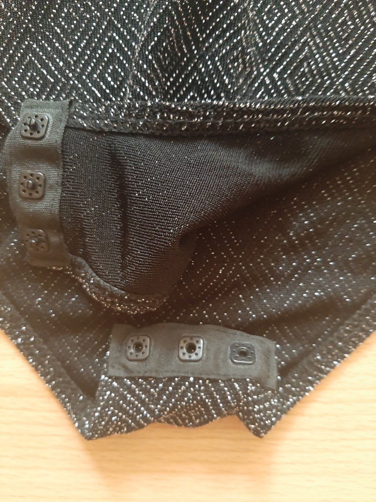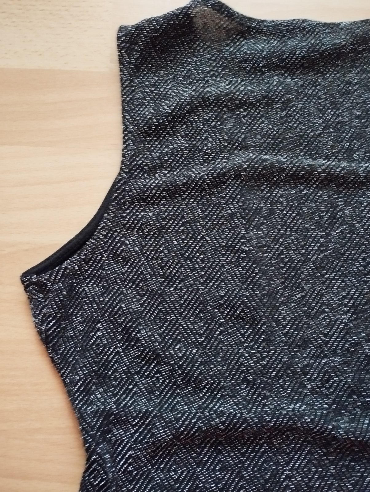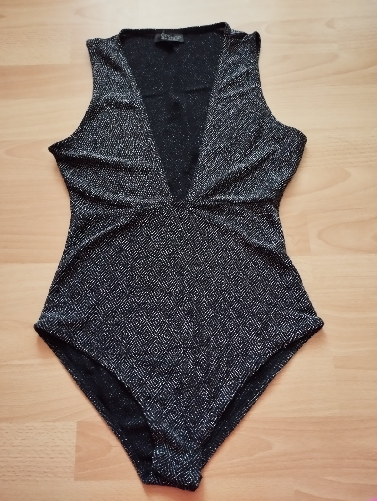 Čierno strieborné ligotavé body s hlbokým výstrihom. Raz oblečené. Dĺžka 64cm, šírka cez prsia 37x2cm.