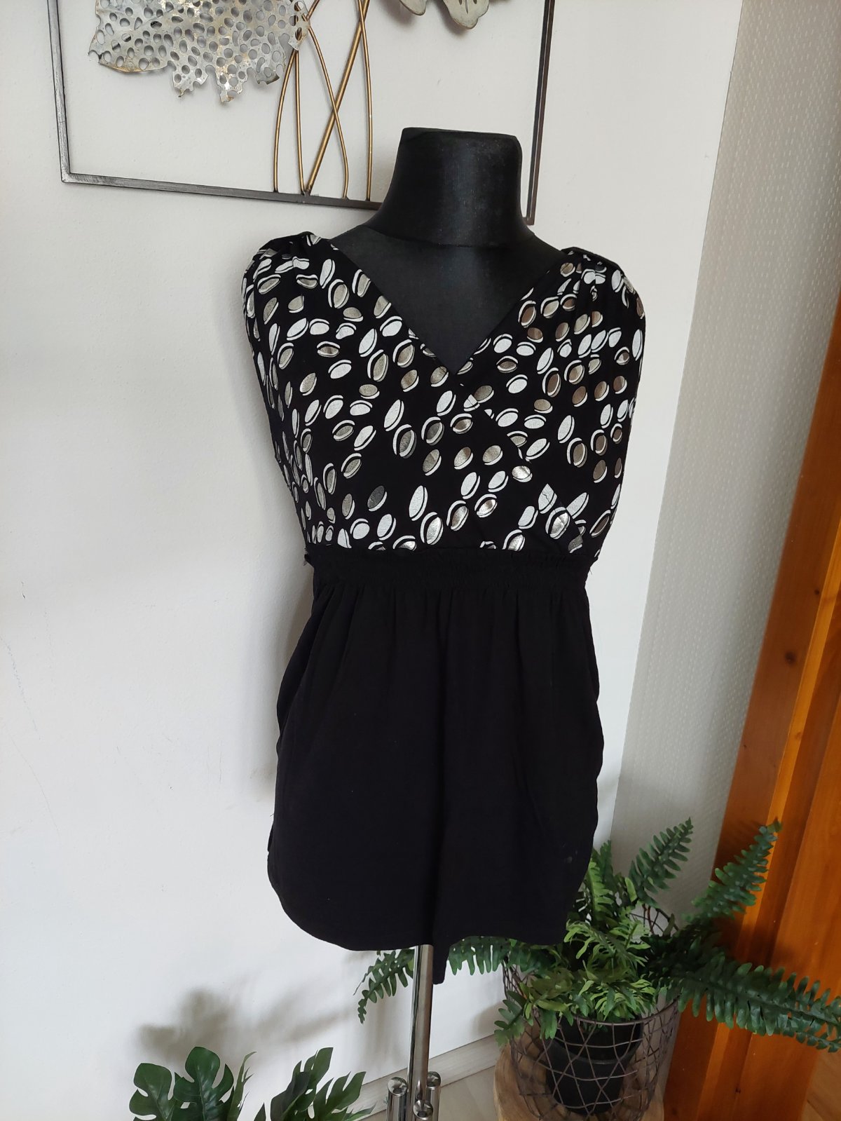 Čierny top značky Promod vo veľkosti L. Ide vlastne o takú vestičku, ktorá ma na sebe našité kovové nity na zapínanie, a je podšitá mierne priesvitnou látkou. Ide o štýlový a elegantný kúsok. Do pá...