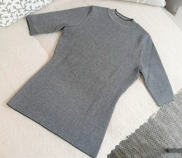 Predám nové, elegantné dámske pletené tričko, elastický materiál. Vhodné je na bežné, aj príležitostné nosenie. Tričko je sivej farby, okraje sú olemované čiernou. Krásne sa prispôsobí postave. Šírka v páse 34cm, na prsiach 41cm v nenatiahnutom stave. Dĺžka od výkroja na krku 55cm. Dĺžka rukávov 32cm. Tričko je veľmi teplé, vhodné so svetrom do chladného až zimného počasia.