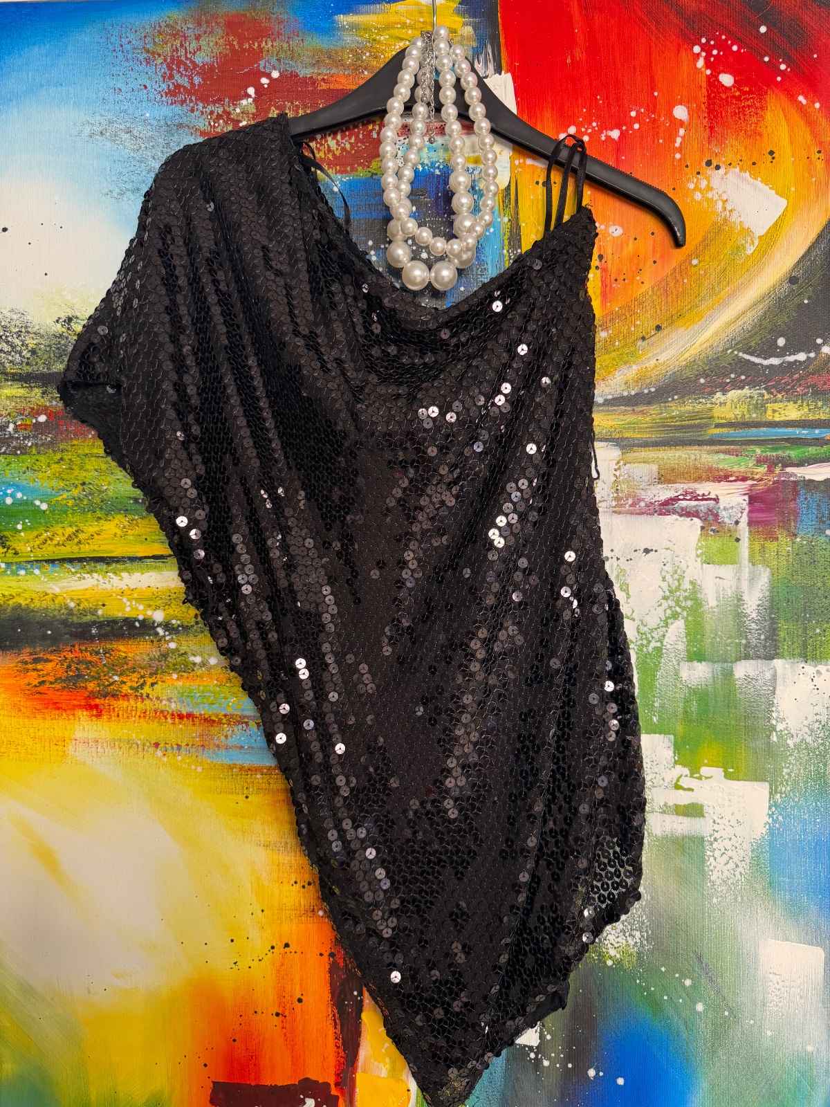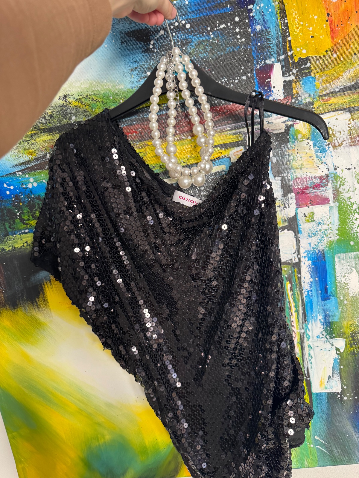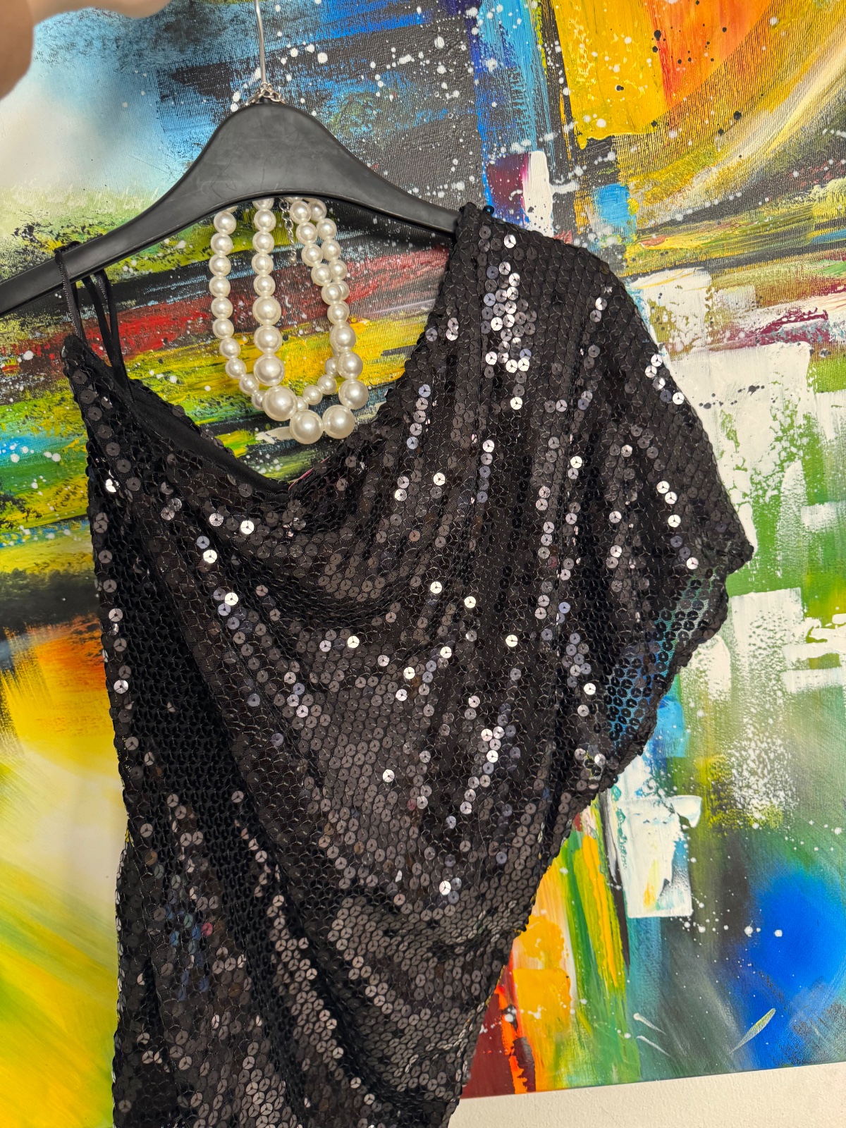 krásne elegantne trblietavé body s asymetrickým ramienkom , cvočkove zapínanie , 93%polyester 7% elasten, písaná veľkosť S ale je menšie. Novy tovar s visačkami . Rozmery : š.38x2 dl. 70cm merane...