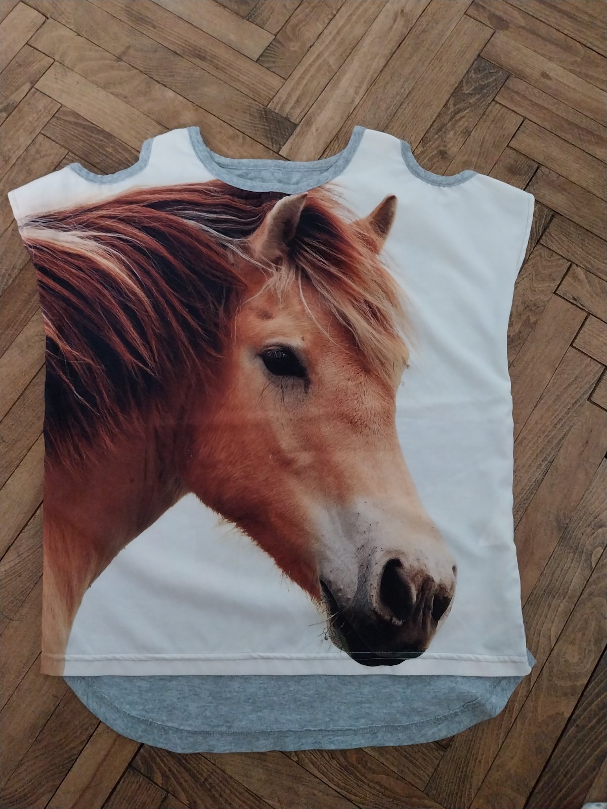 Málo nosené krásne tričko. Veľkosť neuvedená. Asi 152. Dĺžka 57cm a šírka pod pazuchou 47cmx2. Cena 4.50 plus pošta.
