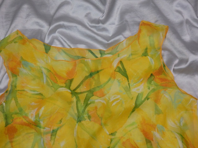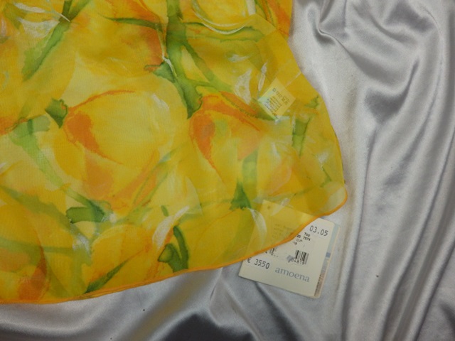 Luxusný letný top žltej farby s potlačou, jemne transparentný, materiál 100% polyester, nový s visačkou.