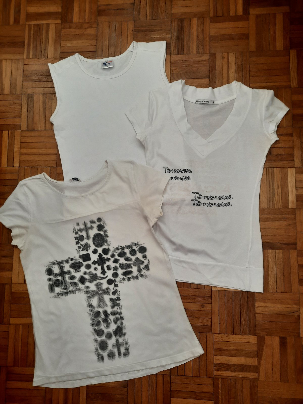 Predám 3 kusy bielych dámskych tričiek v peknom, bezchybnom stave. Veľkosť je S, bez rukávov je M.