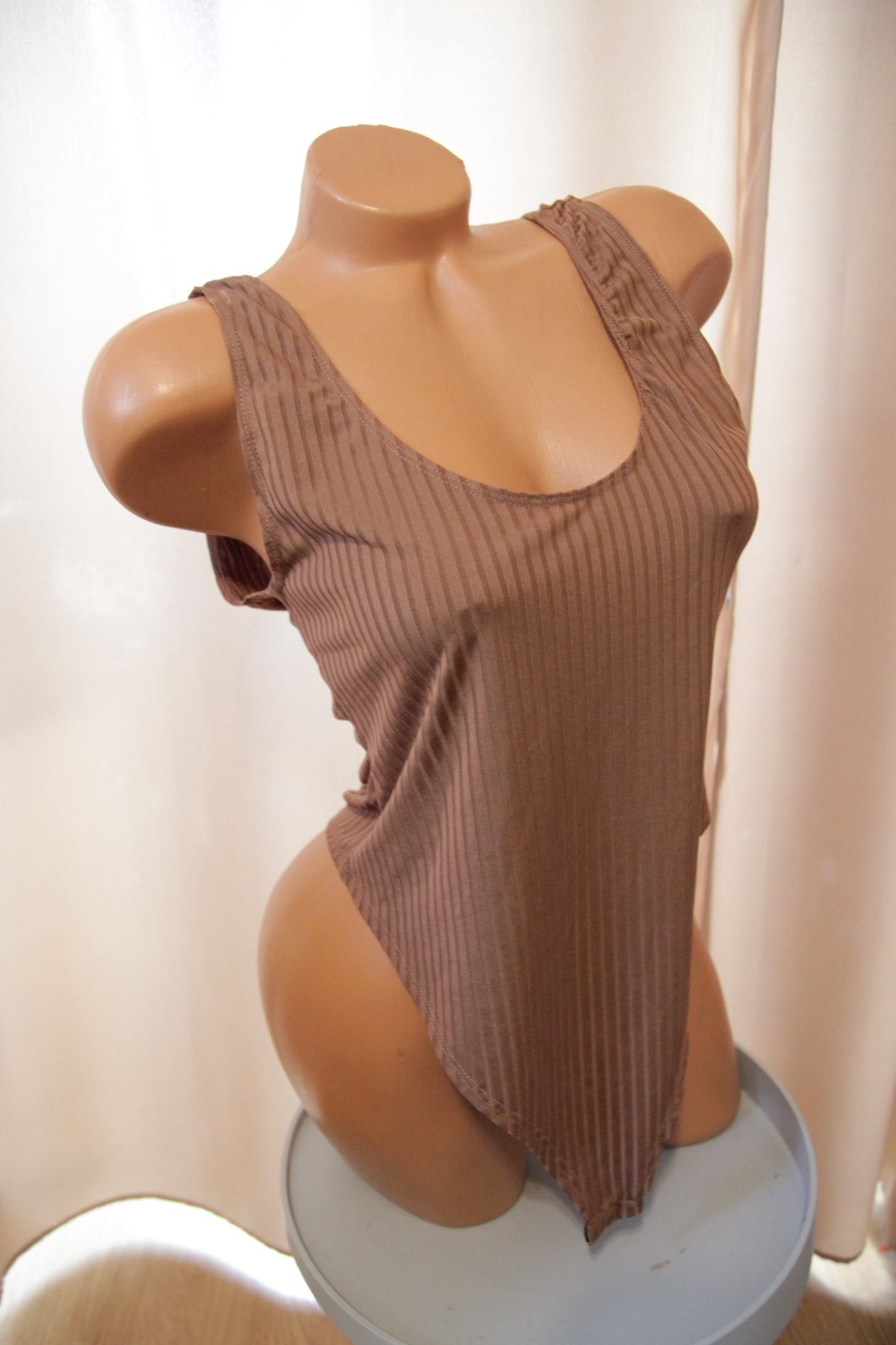 Hnedý elastický body top, s výstrihom na chrbte. Veľkosť L. Značka Founce.