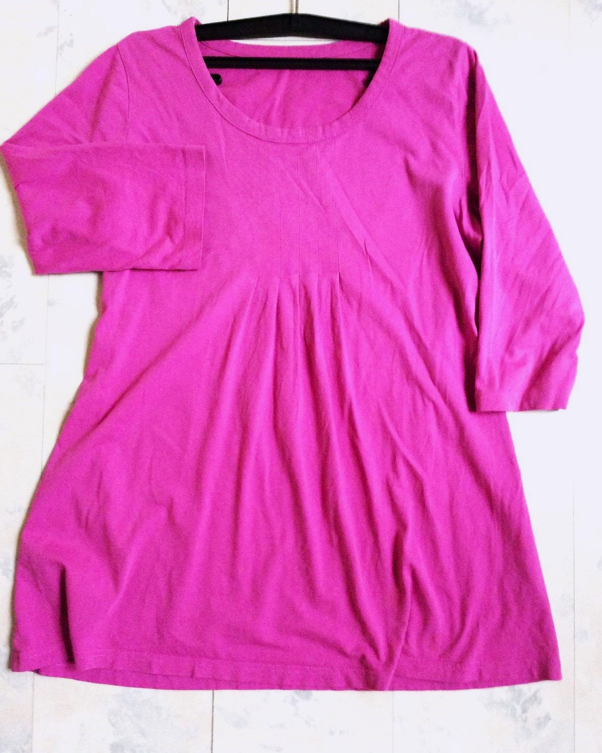 jednoduché bavlnené tričko,krásna malinovo ružová lentilková farba,jemne nariasené, 3/4 rukáv,šírka meraná pod pazuchou = 53 x 2 cm, dlžka celkom = 75 cm, dlžka od pazuchy smerom dolu = 54 cm, rukáv = 43 cm
