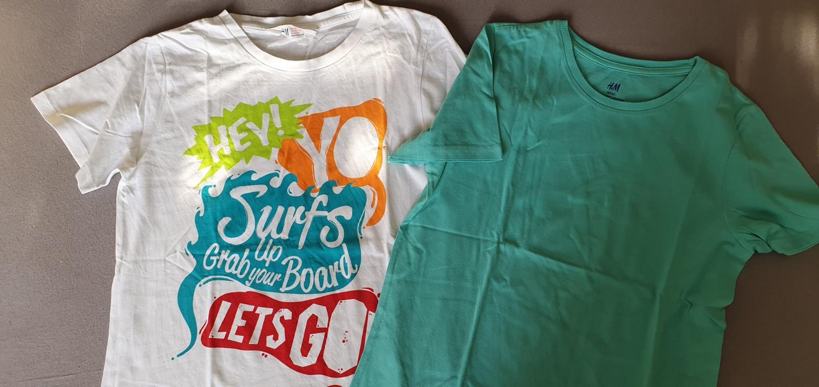 Krásne, vkusné trička 2 ks bez známok opotrebovania, kvalitna bavlna 100%. Drži fomu, mäkké na telo, dotyk, skvelé na každý deň, poteší a zaujme aj fun graf..potlač na tom bielom , zelené tričko je klasické bez potlače.