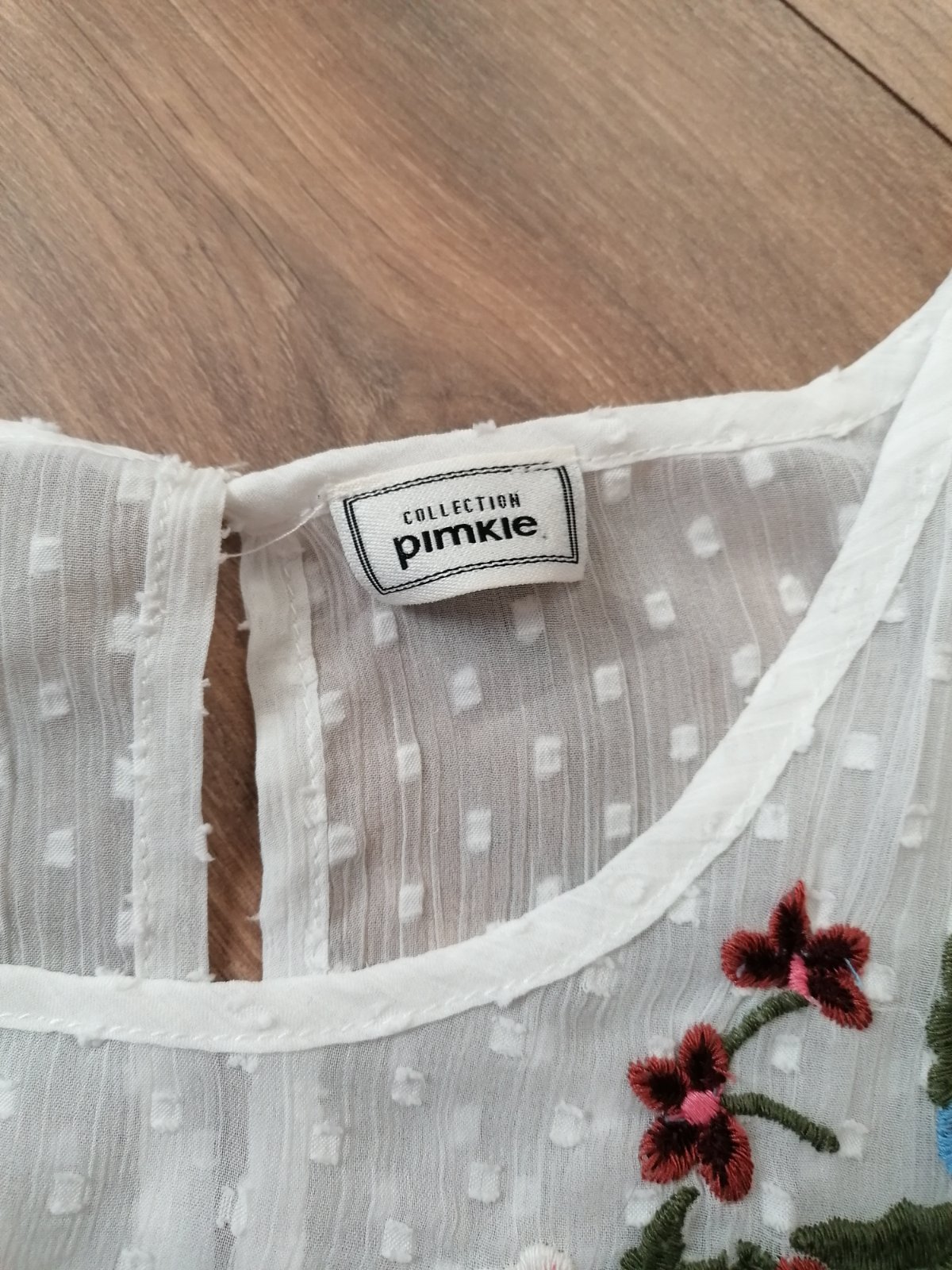 Pekná ľahká blúzka /top, priesvitnejsia látka, od prs dolu podsita ešte nepriehľadnou látkou. Farba nie je snehobiela, skôr taká maslova. Je voľného strihu, veľkosť nie je uvedená, sadne od S az po L. Dĺžka 63 cm, šírka v prsiach 50 cm.