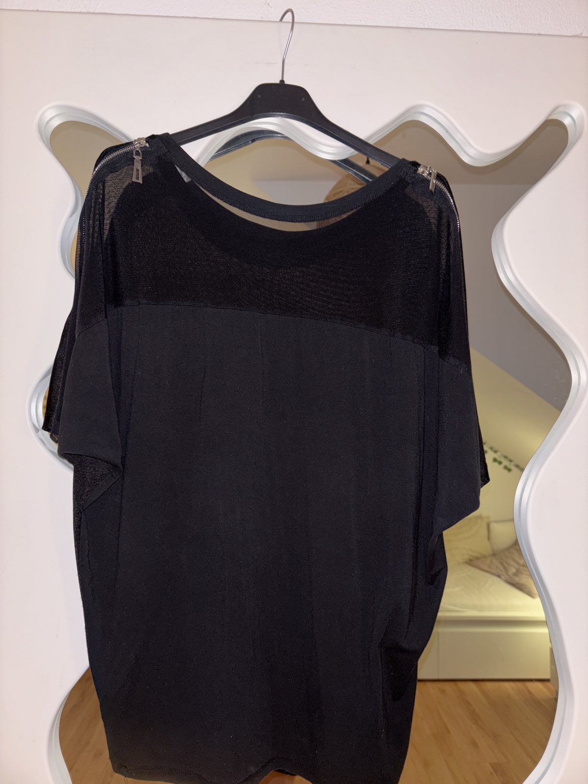 Výborný stav, padavy top, zmesovy úplet, vrch a zadná časť je transparentnejsia, čierny, zipsy na ramenách, sedí na L /XL, šírka pod pazuchami cca 60 cm, dĺžka 67 cm