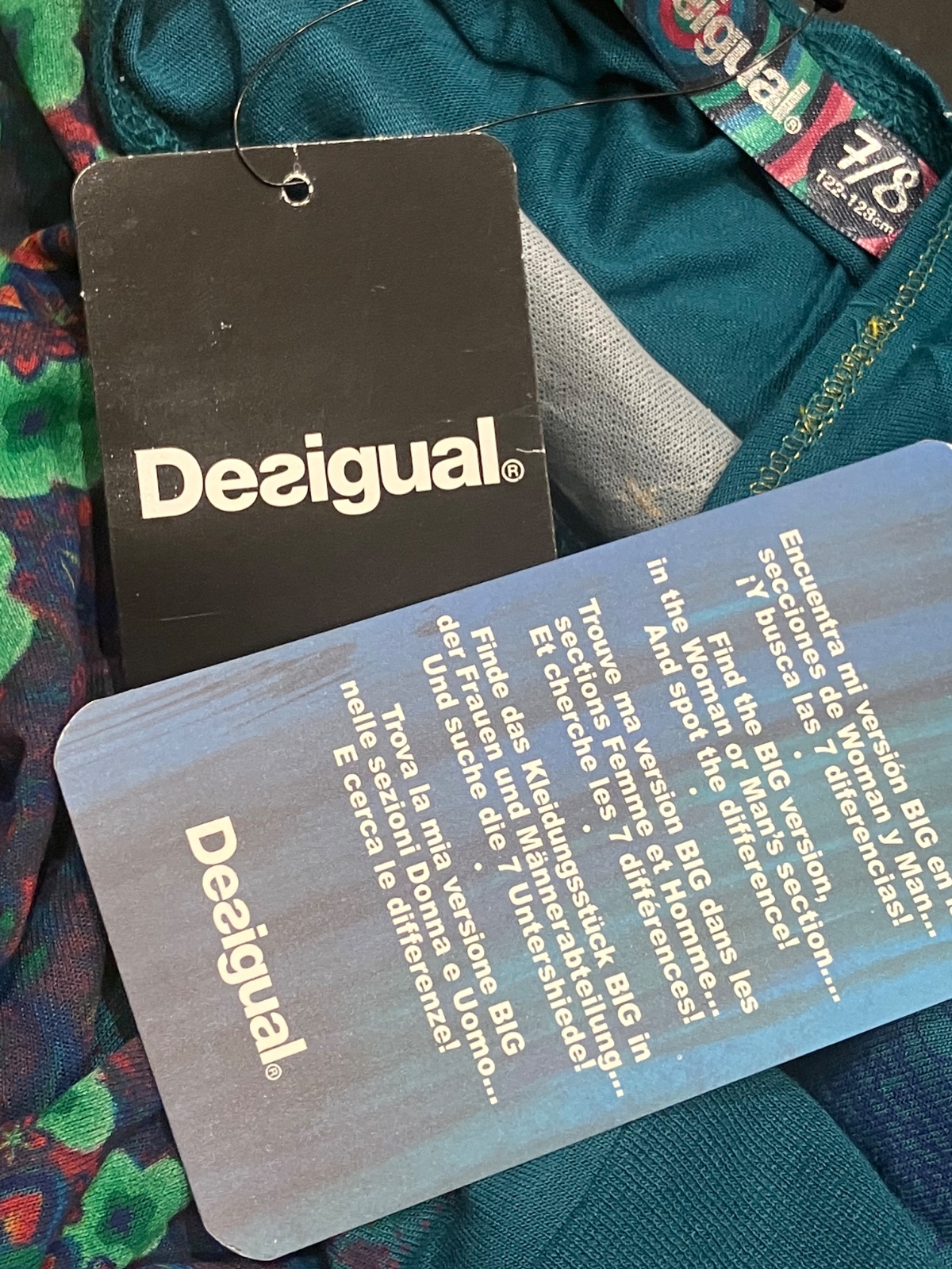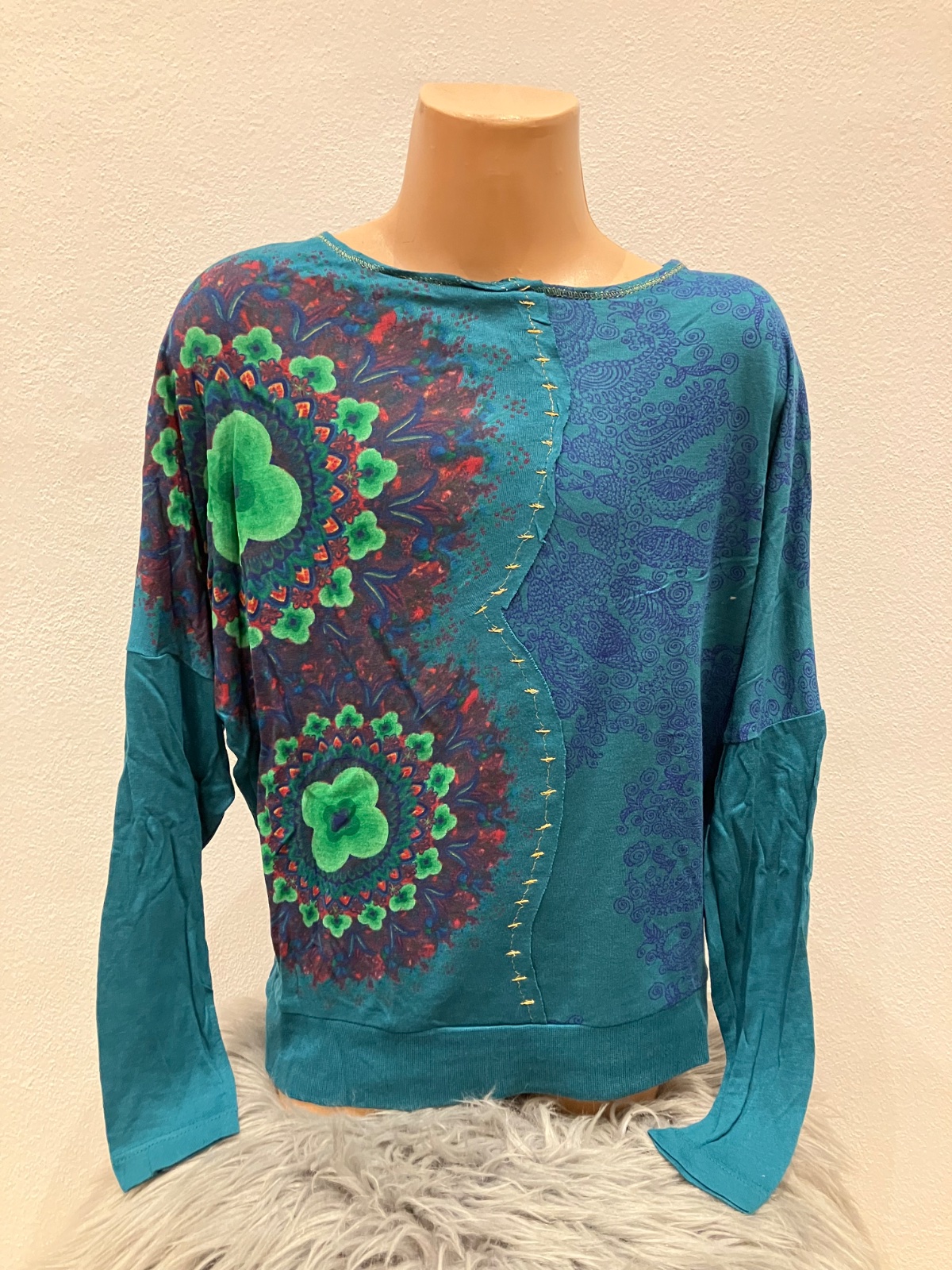 SkladomDievčenské tričko s dlhým rukávom značky Desigual. Okrúhly výstrih. Nie je elastické. Farba: tmavotyrkysová/zelená/zlatá/bordová. Materiál: 100%viskóza.