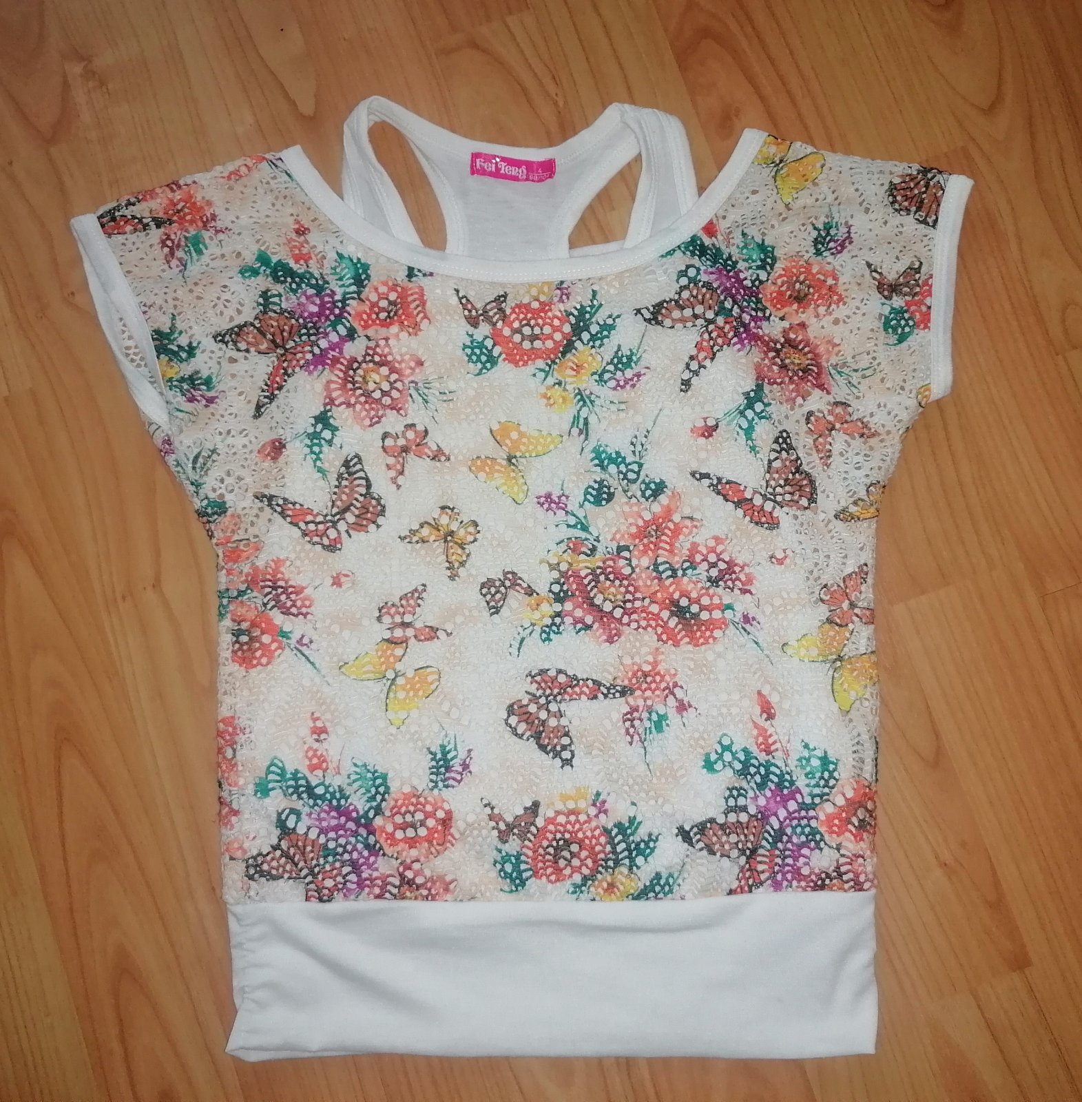 Používané, ale bez známok poškodenia. Veľkosť 98/104. Je to tričko, a pod ním je biele tielko.