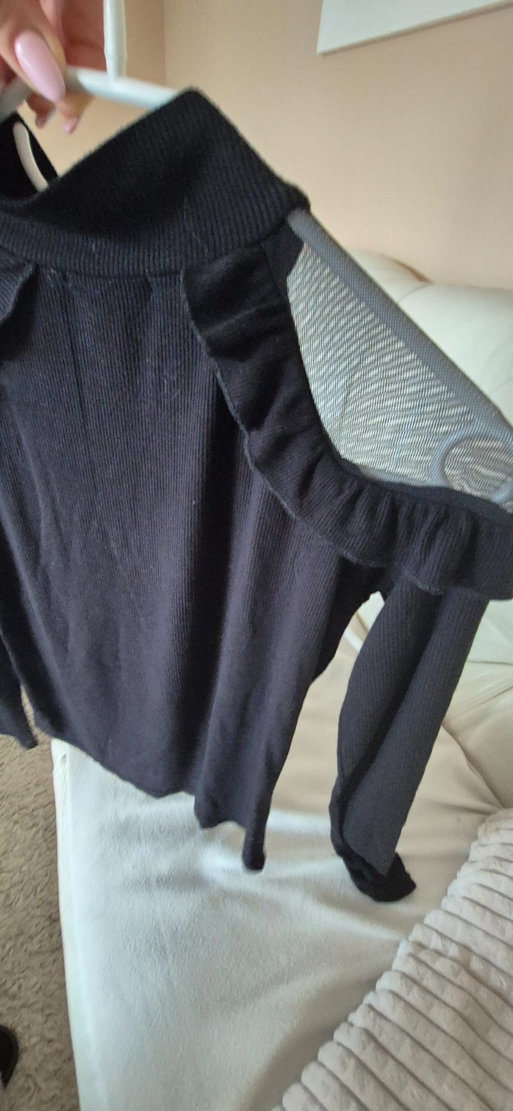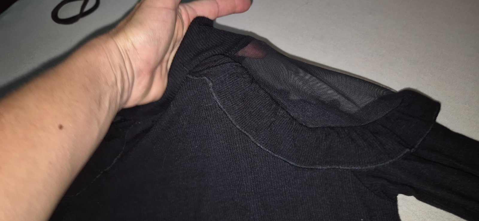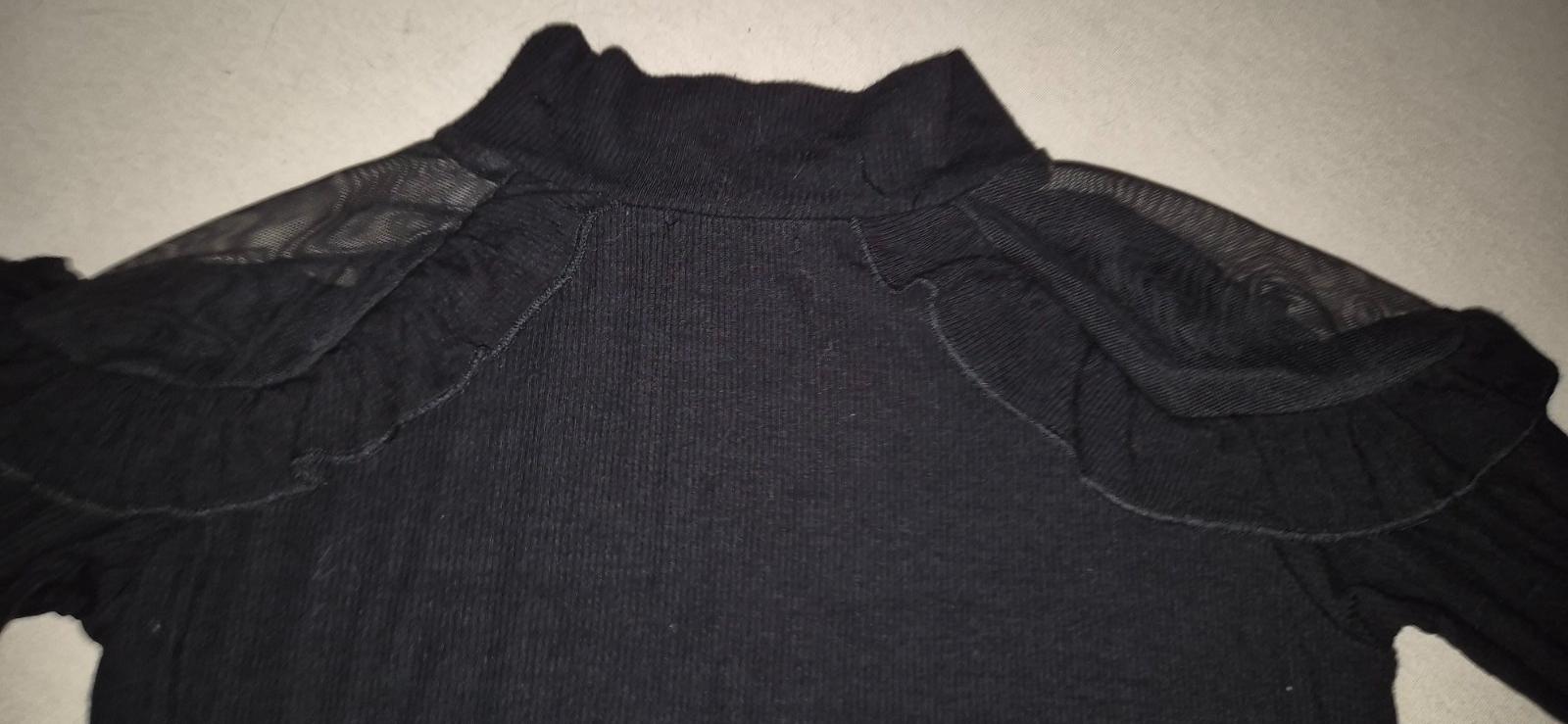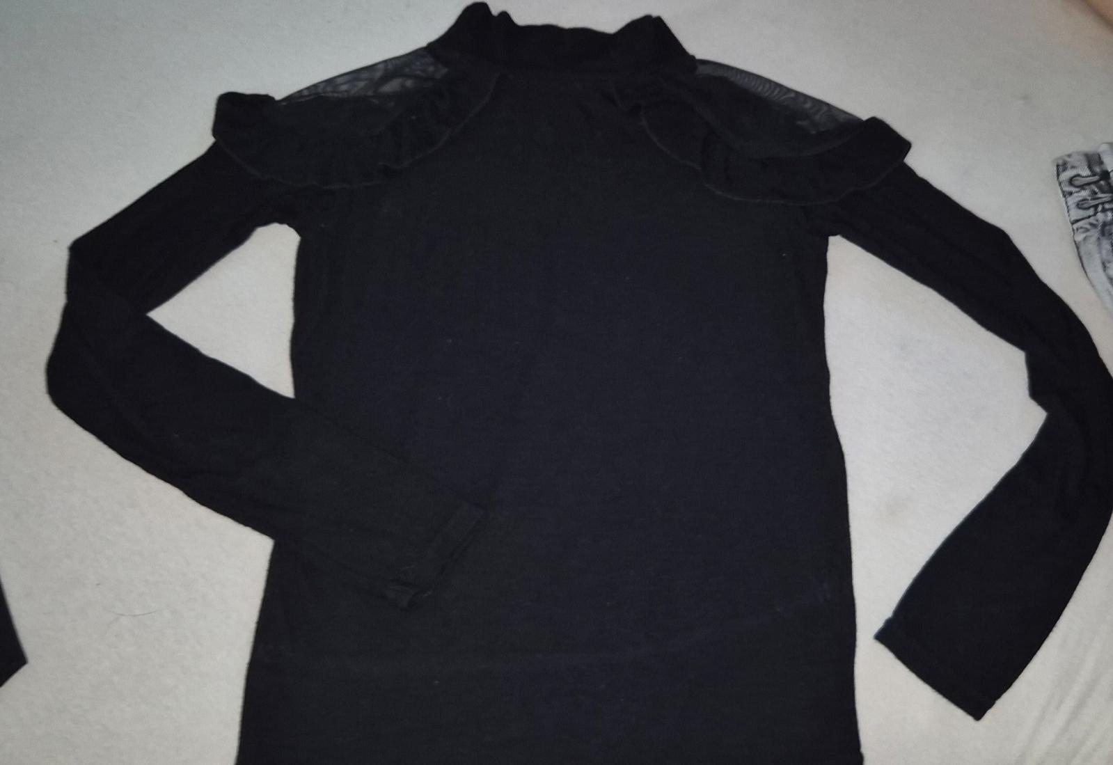 Tričko s volánom na hrudi a rukávy rozšírené do zvona.