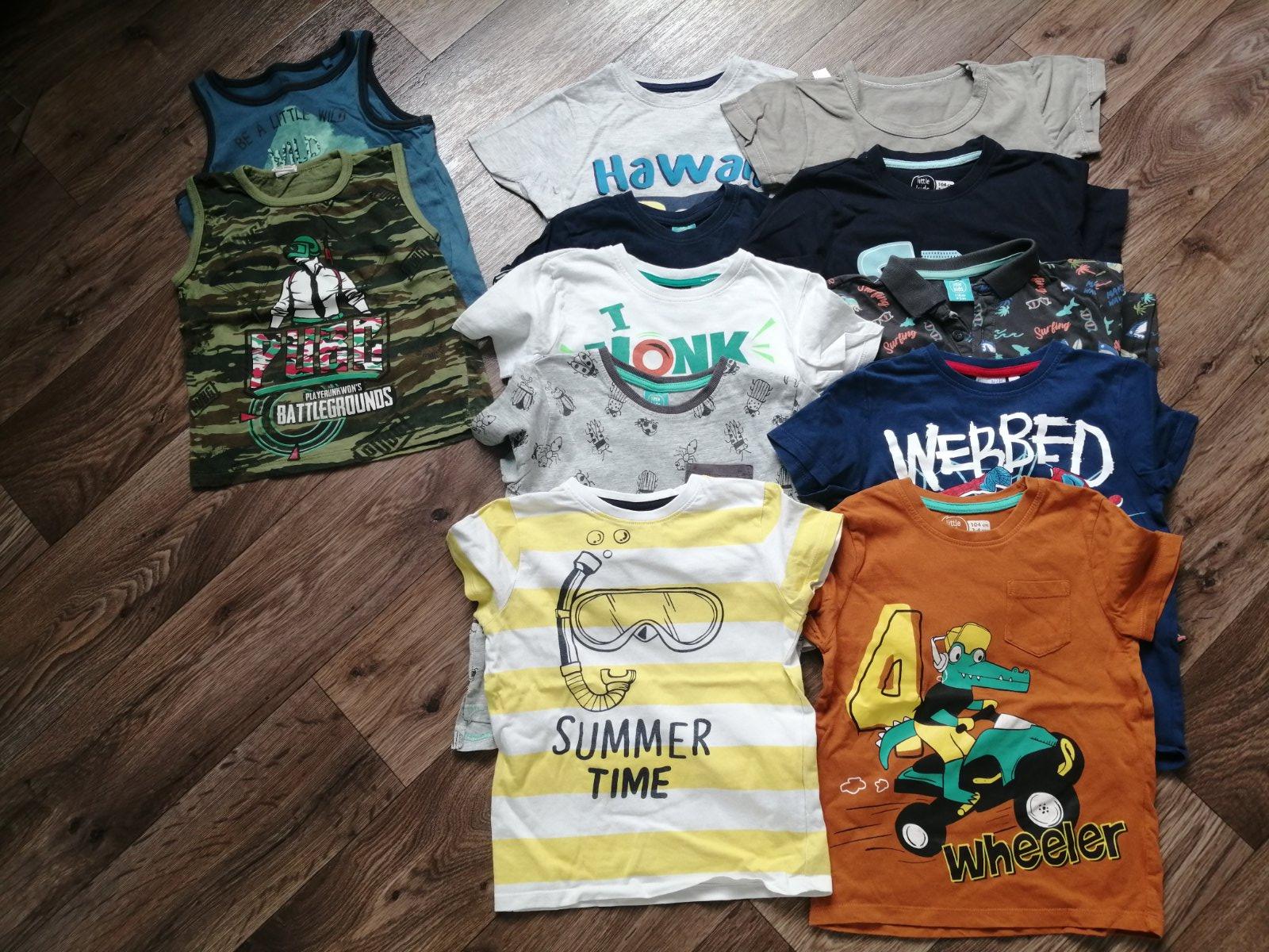 Prevažná väčšina z pepca, sú tam 2 tielka a 10ks tričiek, sú v top stave, len na žlto bielom je menší fľak, sú tam veľkosti 98/104/110 ale všetky sedia na veľkosť 104. Cena plus poštovné