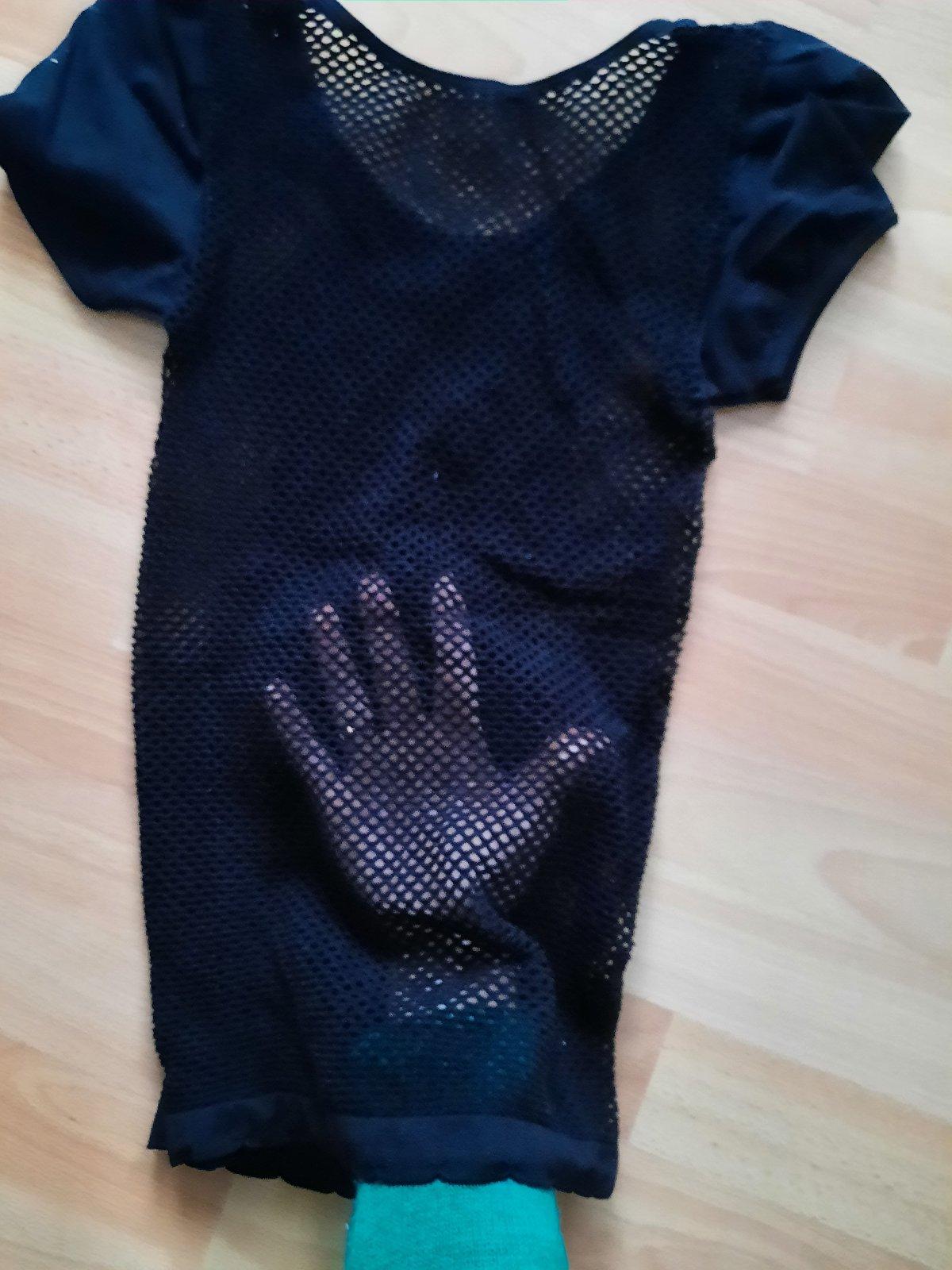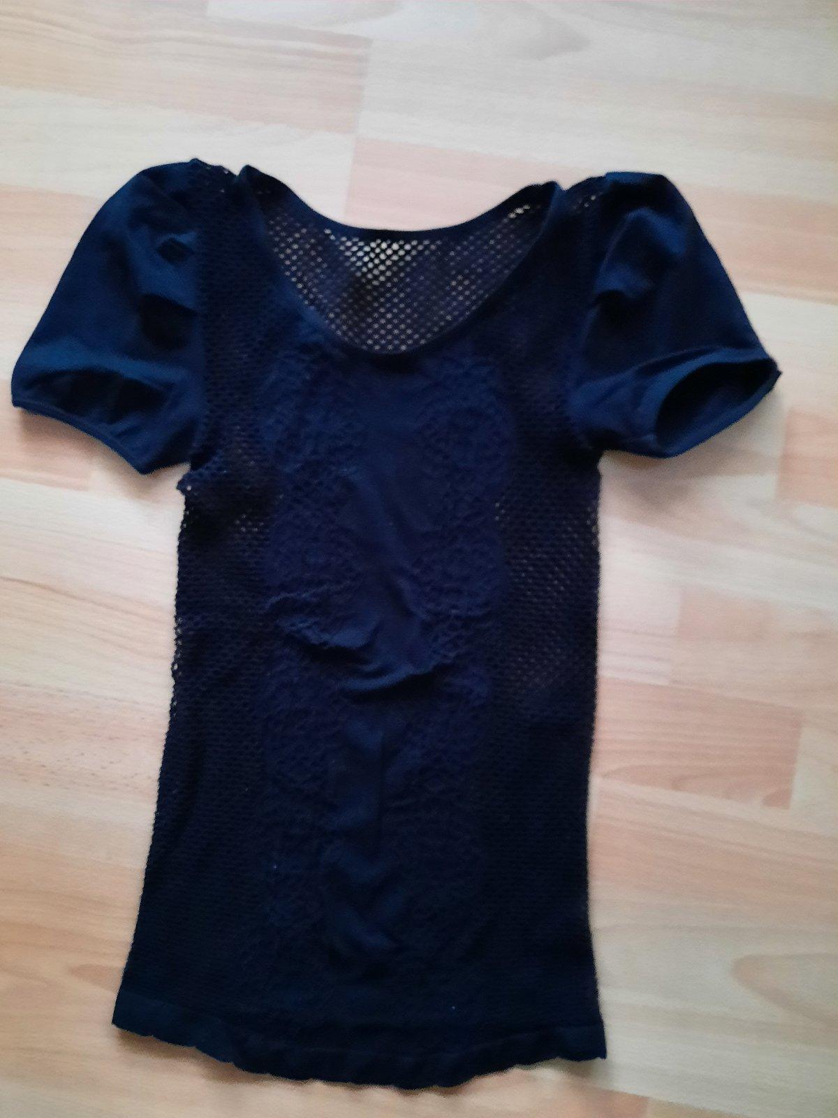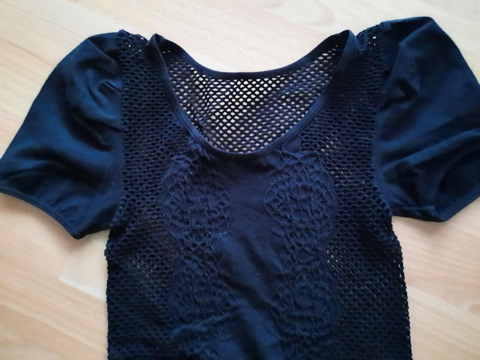 Predám dámske tričko s krátkym rukávom. Na bokoch, vzadu a vpredu od pŕs dole je dierkovaná (sieťkovaná) látka. Rukávy a pri prsiach je látka plná, nepriesvitná. Top stav, ako nové- boli iba vyprané. Pekne formujú postavu. Je aj elastické, takže sa natiahne viac ako je na rozmeroch na poslednej fotke.