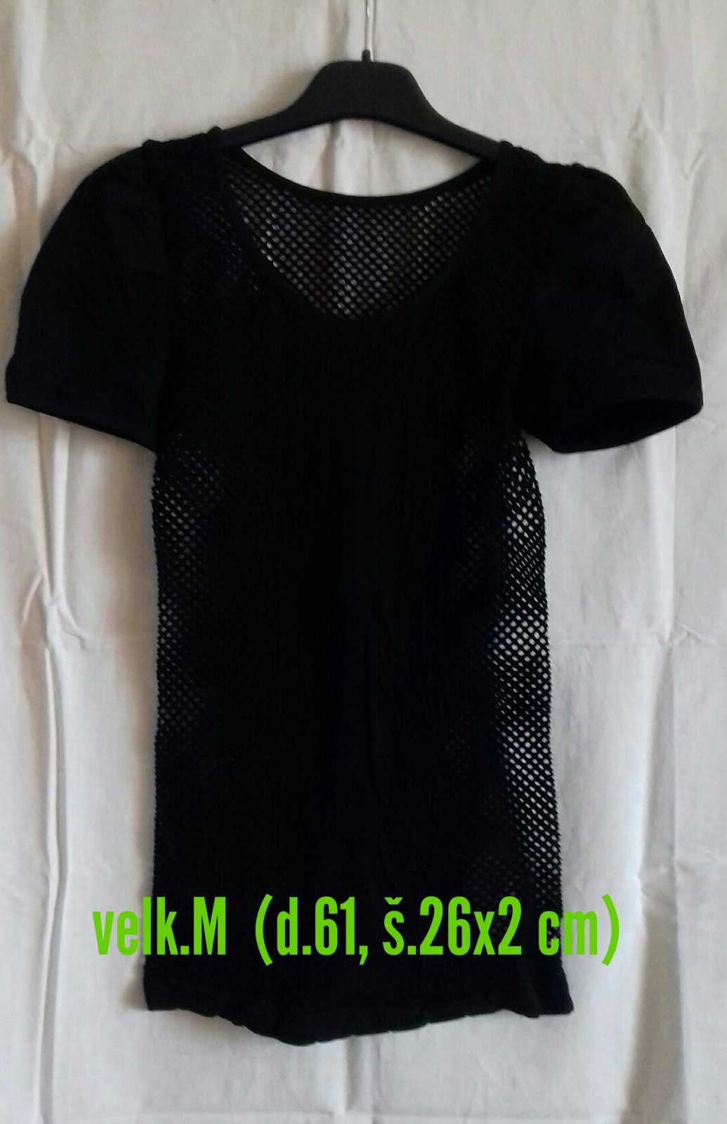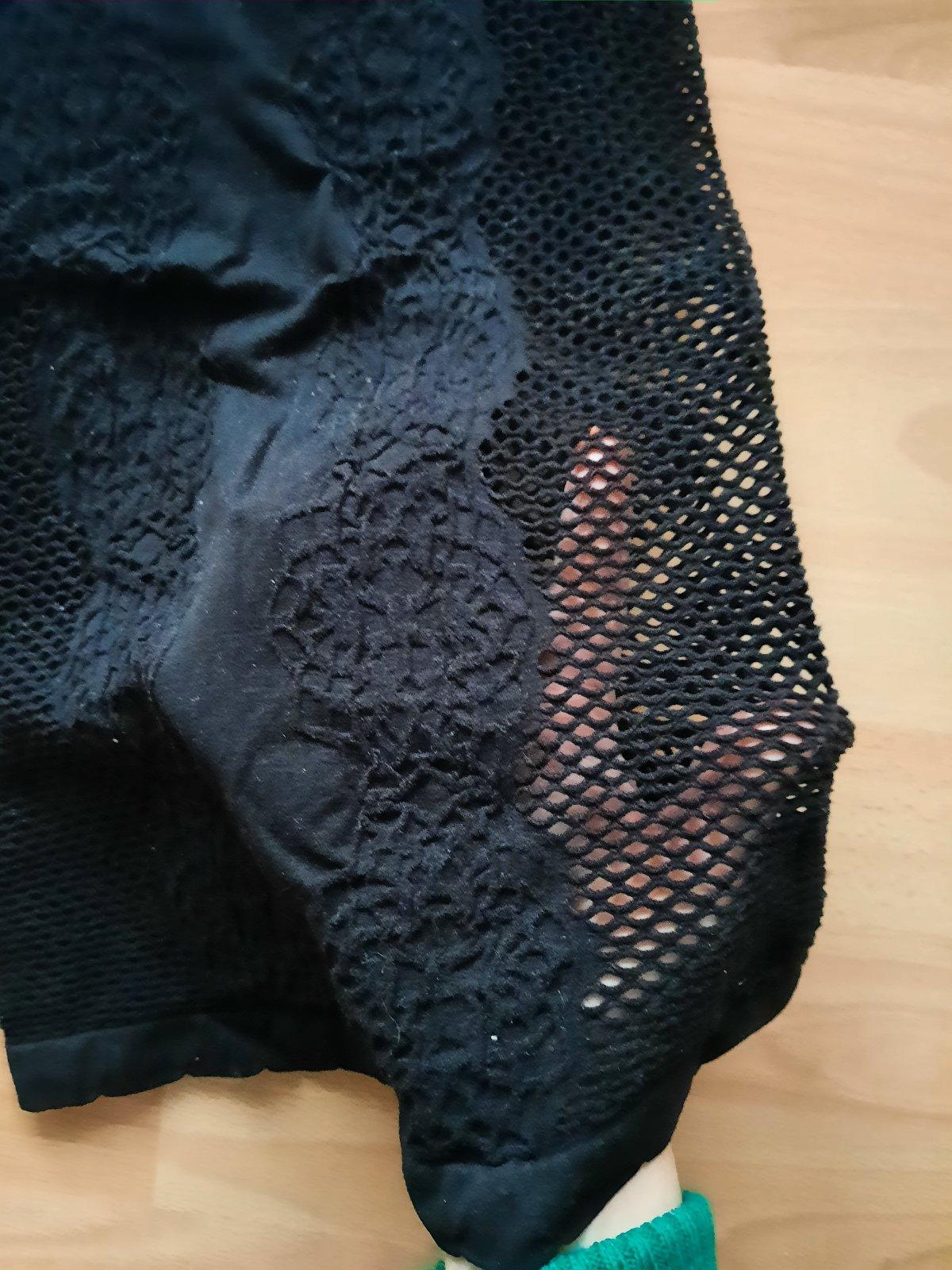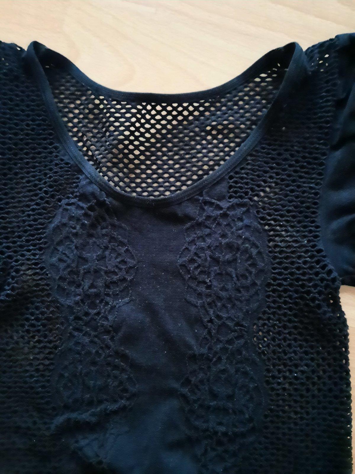 Predám dámske tričko s krátkym rukávom. Na bokoch, vzadu a vpredu od pŕs dole je dierkovaná (sieťkovaná) látka. Rukávy a pri prsiach je látka plná, nepriesvitná. Top stav, ako nové- boli iba vyprané. Pekne formujú postavu. Je aj elastické, takže sa natiahne viac ako je na rozmeroch na poslednej fotke.