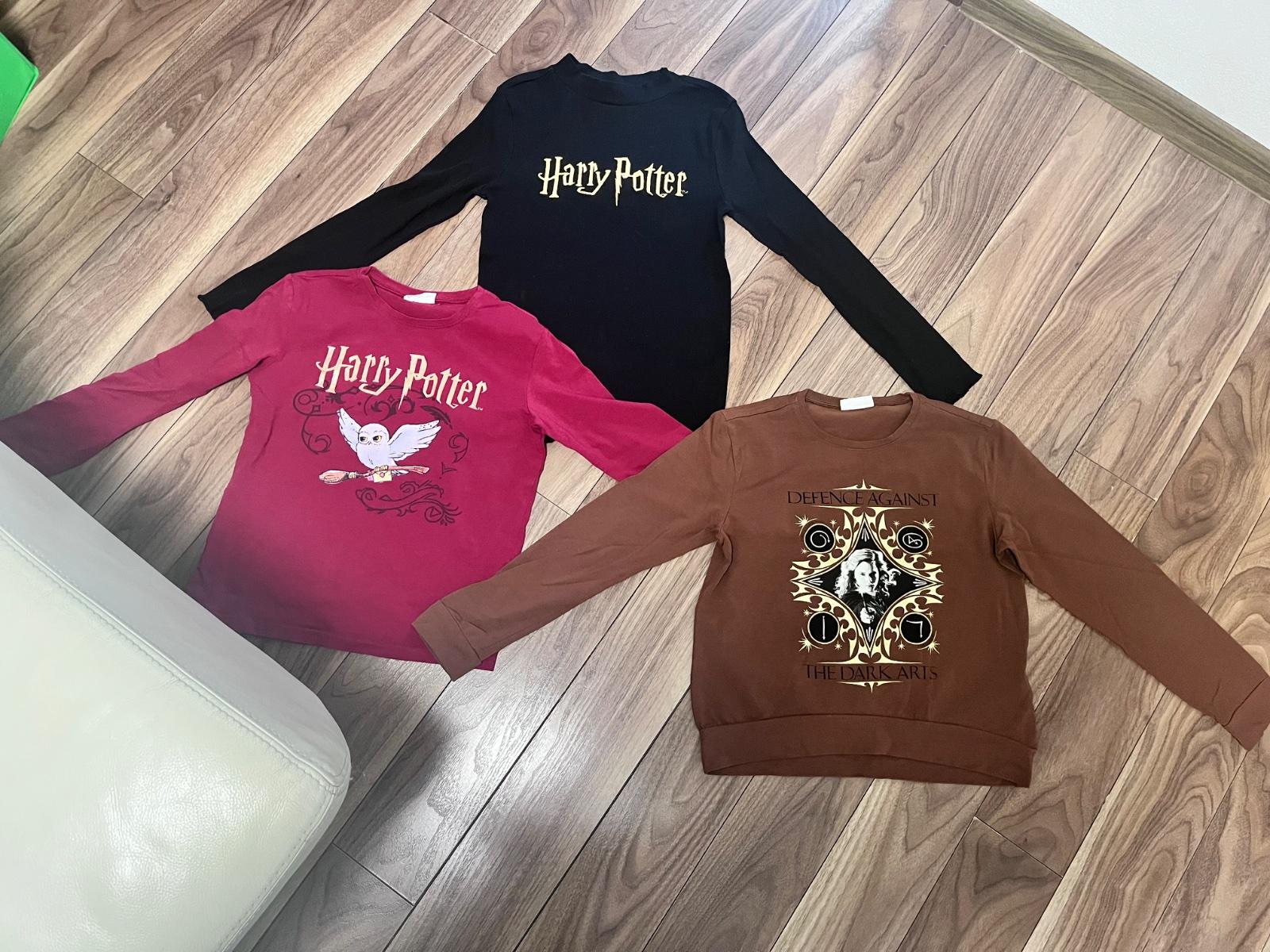 Predám tričká s dlhým rukávom Harry Potter, čierne tričko veľkosť 152, červené tričko 140, hnedé tričko 146. Cena spolu 7eur, cena osobitne 2,70/kus.