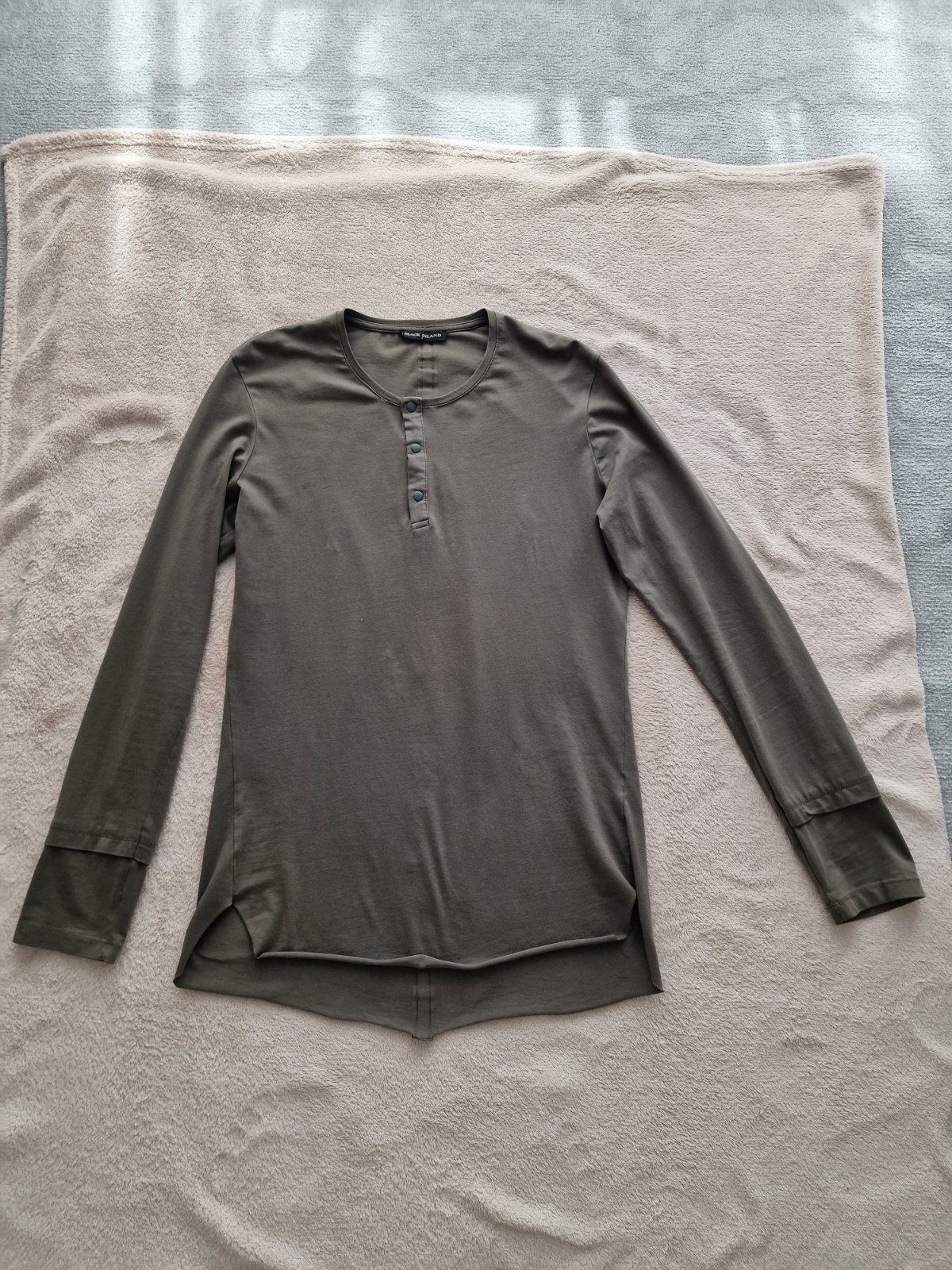 Ponúkam unikátny kúsok do šatníka. Predĺžený nátelník tureckej špičkovej značky Black Island. Pozri detailne fotky. Vpredu akoby gombíky a vzadu cez celý chrbát ide prišitá stuha. Veľkosť XS/S, slim fit na chudého chalana/pána. Určený pre extravagantný typ chalana. Dĺžka 70 vpredu/77 vzadu. Rukáv 67 od ramena, 67+12 od krku. Pod pazuchami 50 cm.