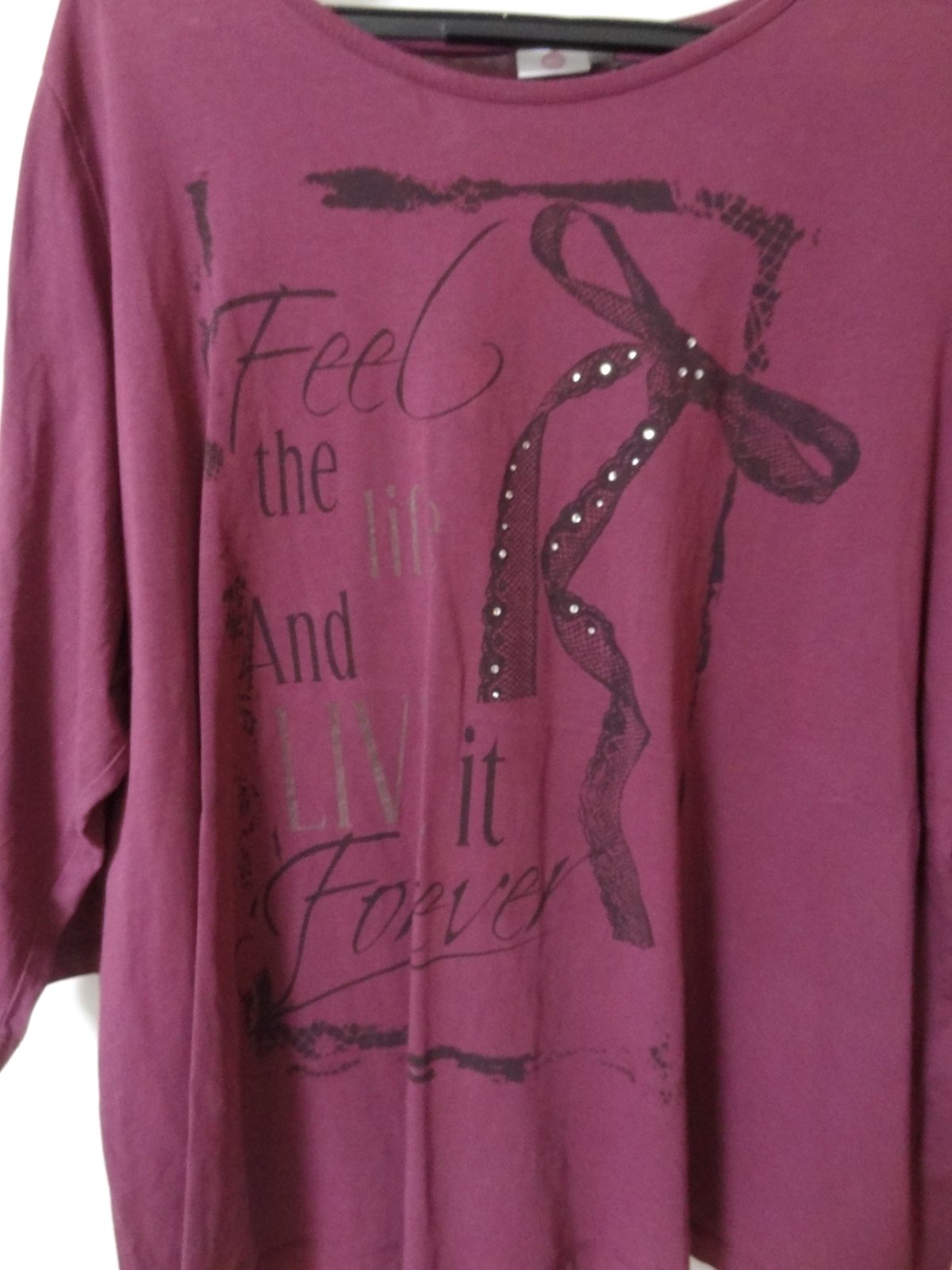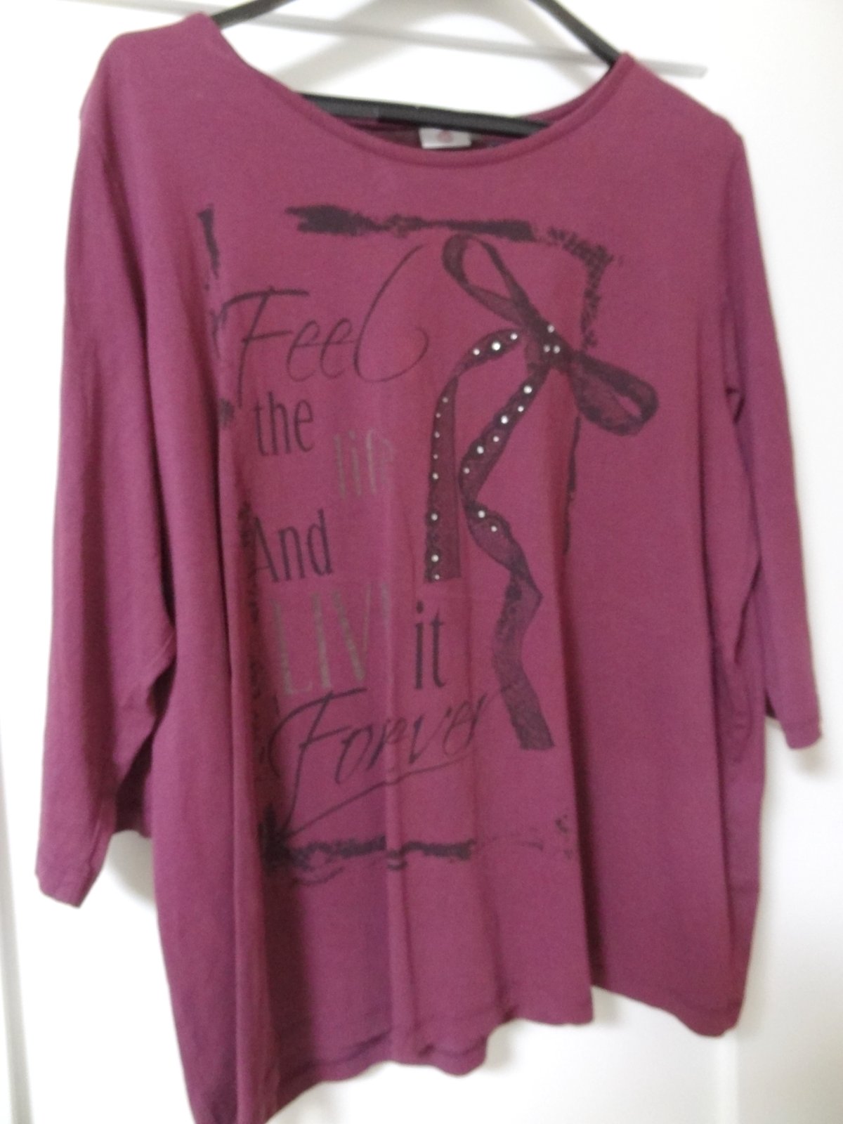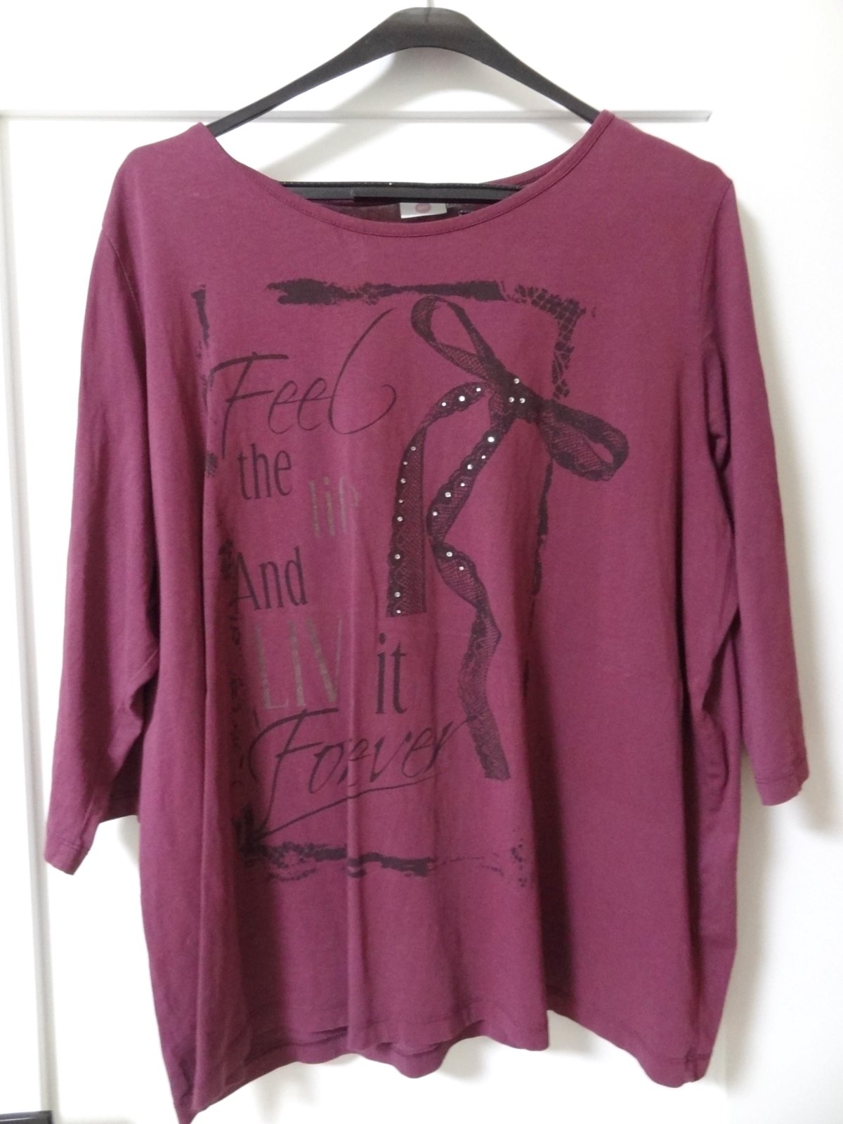 Dámske tričko zdobené kamienkami ... veľmi dobrý stav... značka: ME ... uvedená je veľkosť 54/56 , ale skôr sa hodí na 52 .... dlžka 73 cm, šírka pod pazuchami 67 cm