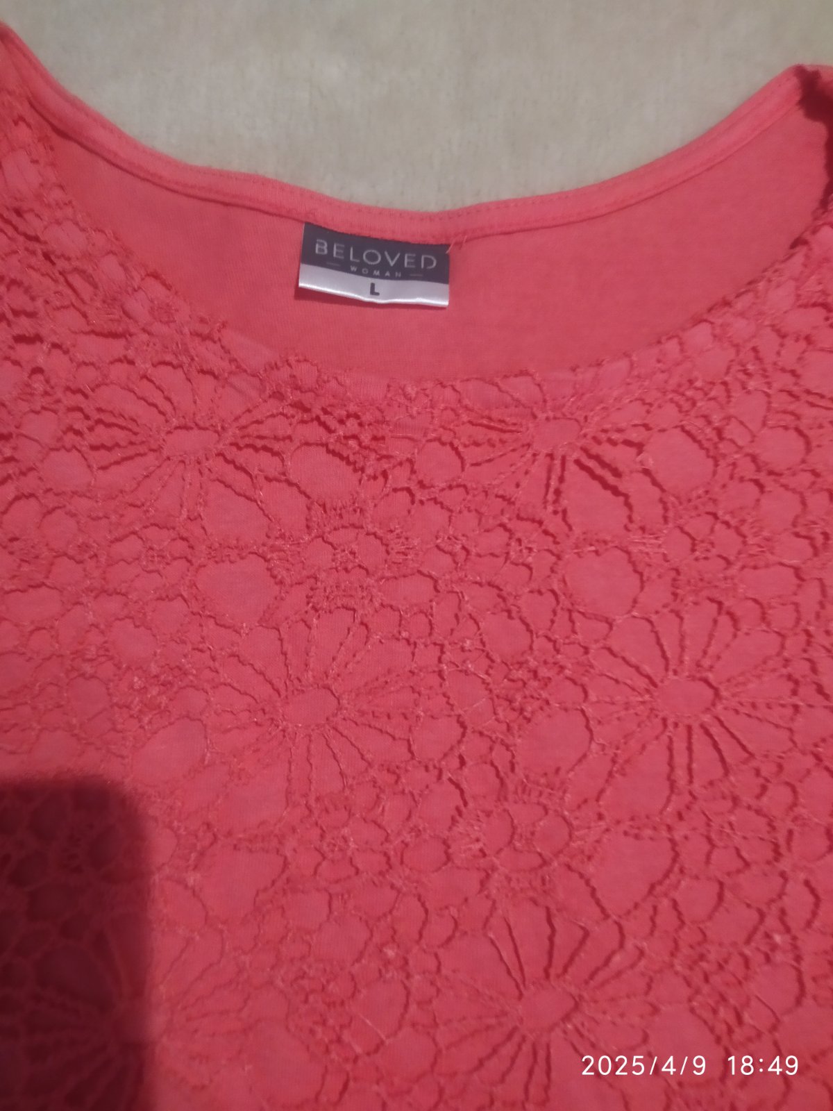 Asi 2x oblečené pekné čipkované tielko na ramienka, vhodné aj pre tehotné. Top stav. Cez prsia cca 34,5 cm, dĺžka cca 66 cm. Farba ako na 1 foto. Skôr tmavšia lososová. Veľkosť uvedená XL/XXL, ale ...