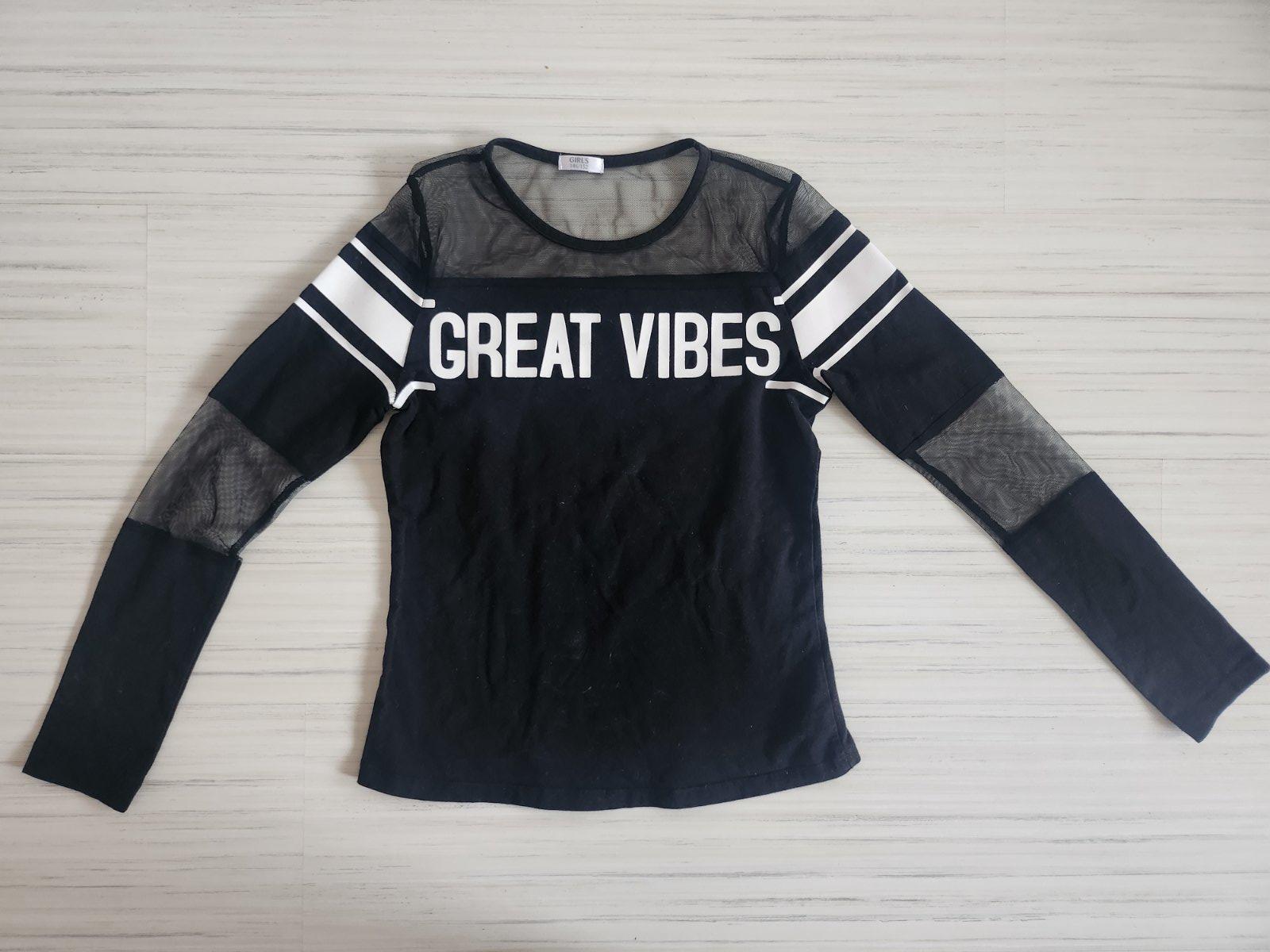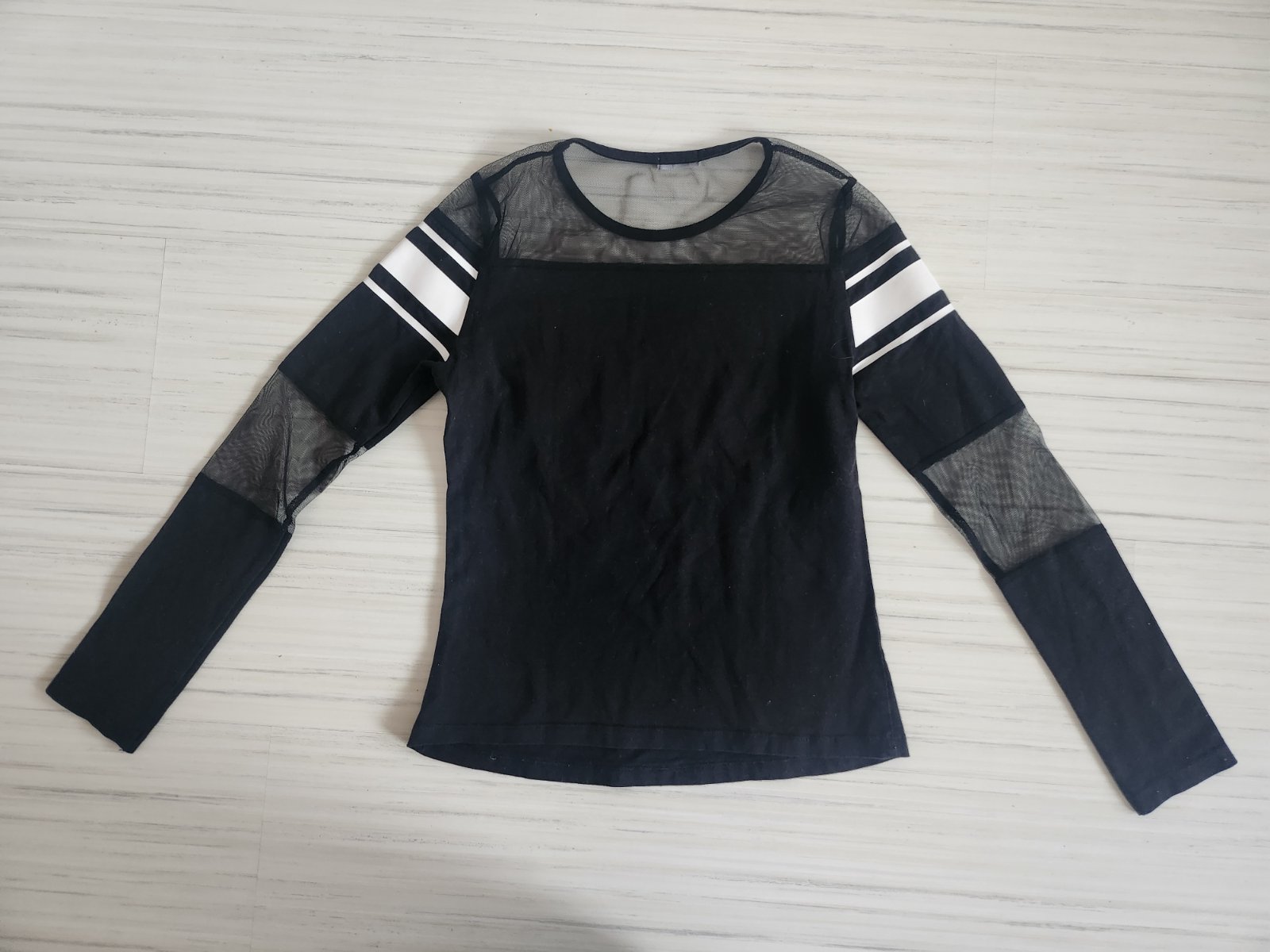 Krásne tričko s dlhým rukávom. Na hornej časti a aj na rukávoch priesvitná zaujímavá sieťka.Je v top stave. Písaná je veľkosť 146,ale sedí na 134-140.