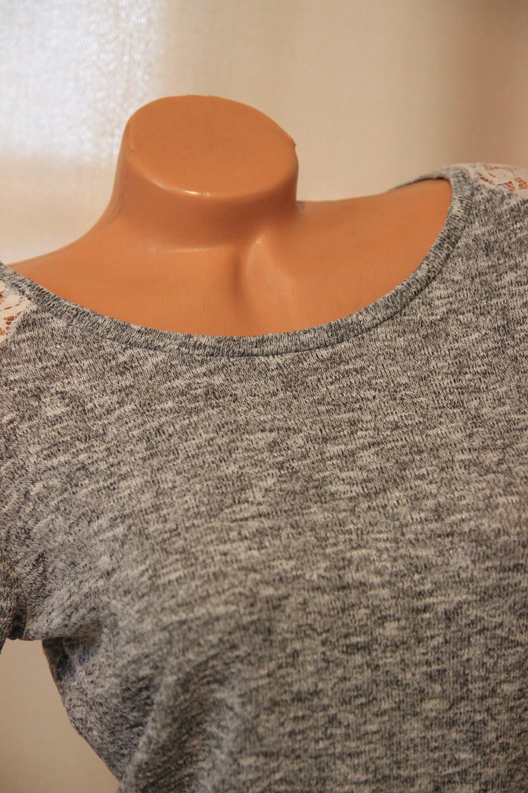 Šedo biely top s čipkou, veľkosť M, nosený, má pár mini žmolkov, inak pekný stav.