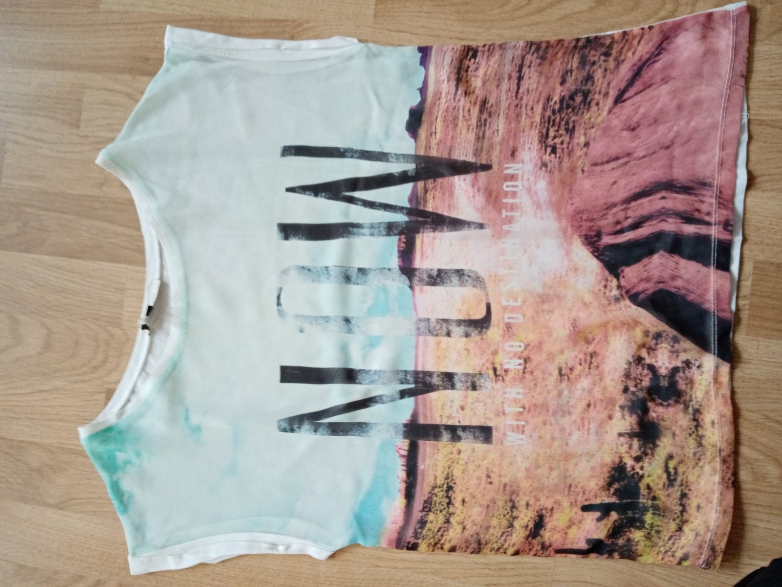 pekné tričko s potlačou, veľkostne sedí S-M, bez poškodení, potlač nepoškodená, mierne odhalený chrbát
