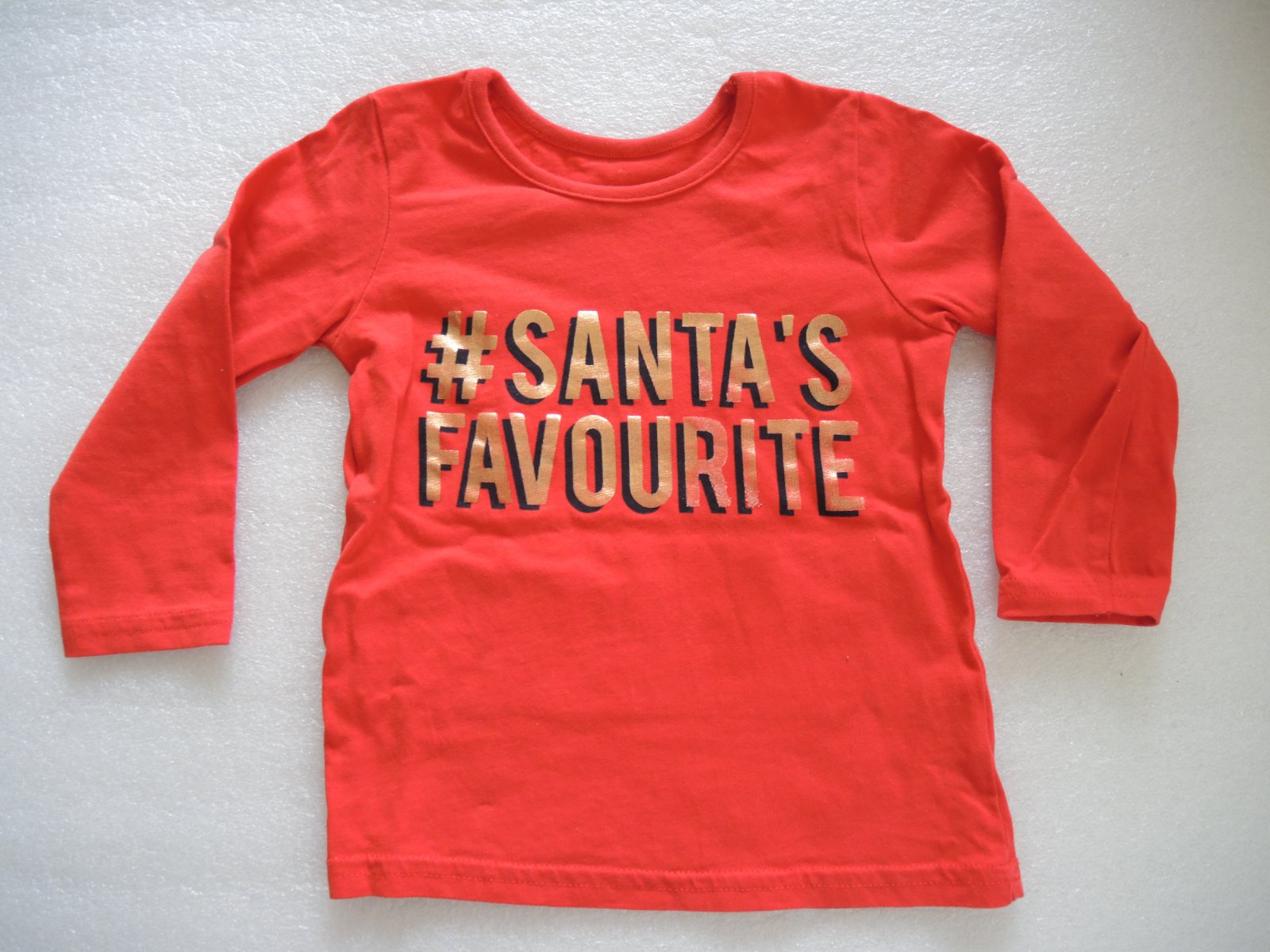 Predám krásne tričko už len pre nenáročnú mamičku. .... Je so zlatým nápisom santa´s favourite (santove obľúbené). Mali sme ho asi raz, nie je žmolkavé, ani fľakaté. Len žiaľ zlatá podtlač na písmenách A, R a I sa začína troška pri kraji odlupovať. .... Ale tričenko je veľmi jemné, príjemné na nosenie. Aj keď len na spinkanie či po byte ešte poslúži. Veľkosť je uvedená 80/86, čo aj sedí. Celková dĺžka je 36 cm. (V02)
