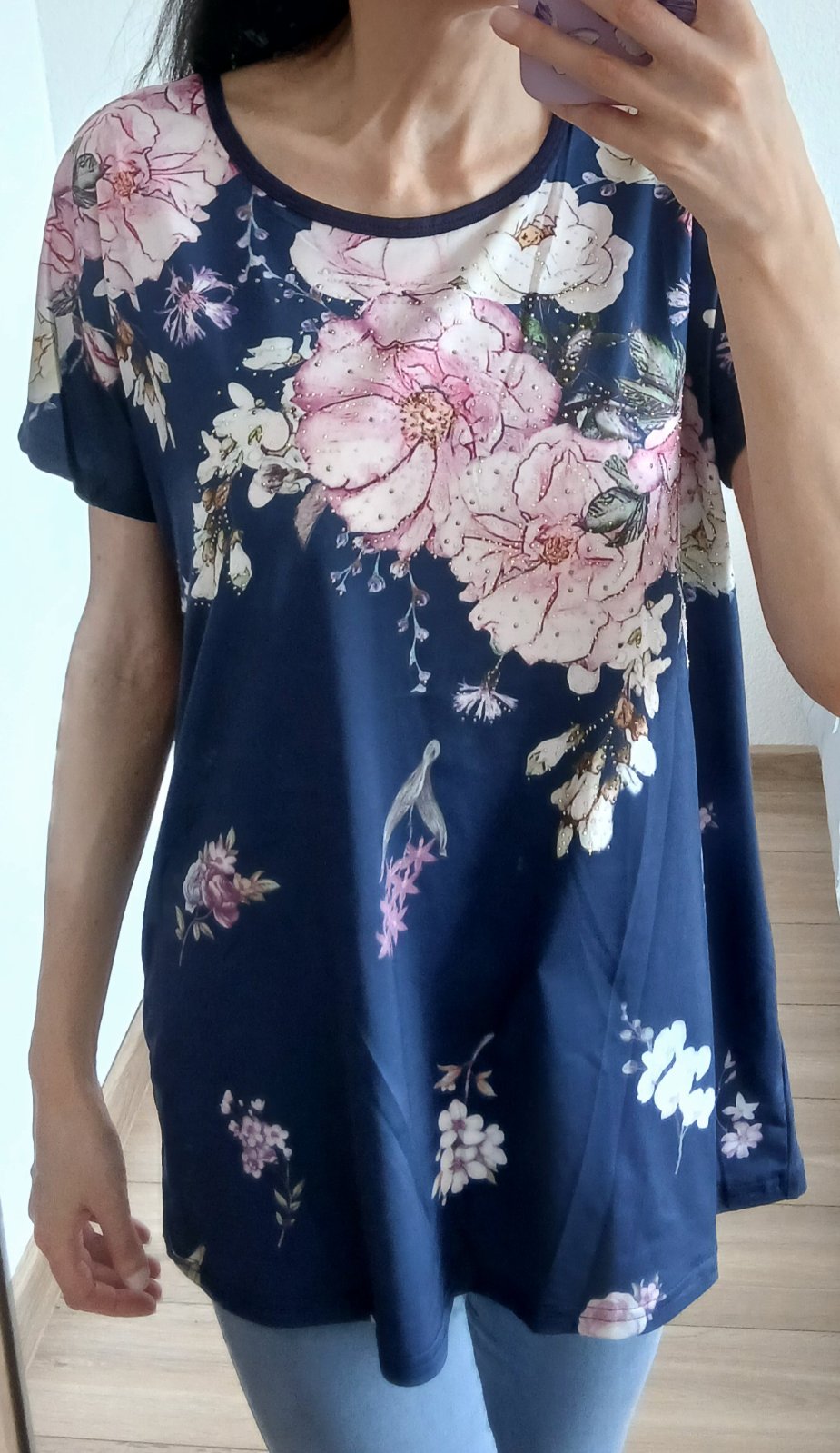 tmavo modre až skoro čierne tričko nosene, pisane XL...podla mne tak L...širka 46cm, dlzka 59 cm, mierne pidi zmolky , elastické