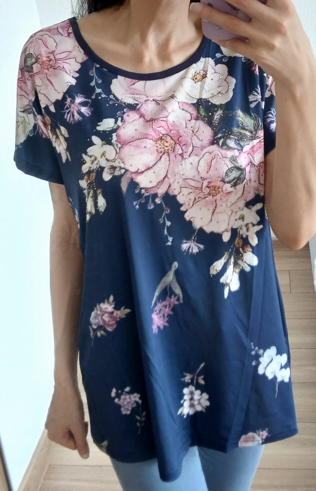 Pohodlné dámske tričko s krátkym rukávom,potlačou,zdobené s kamienkami. Na spodku s mašličkou. Elastické. Materiál:95%bavlna,5%elastan. Veľkosť L/XL. Krajina pôvodu: P.R.C. ROZMERY: Celková dĺžka ...