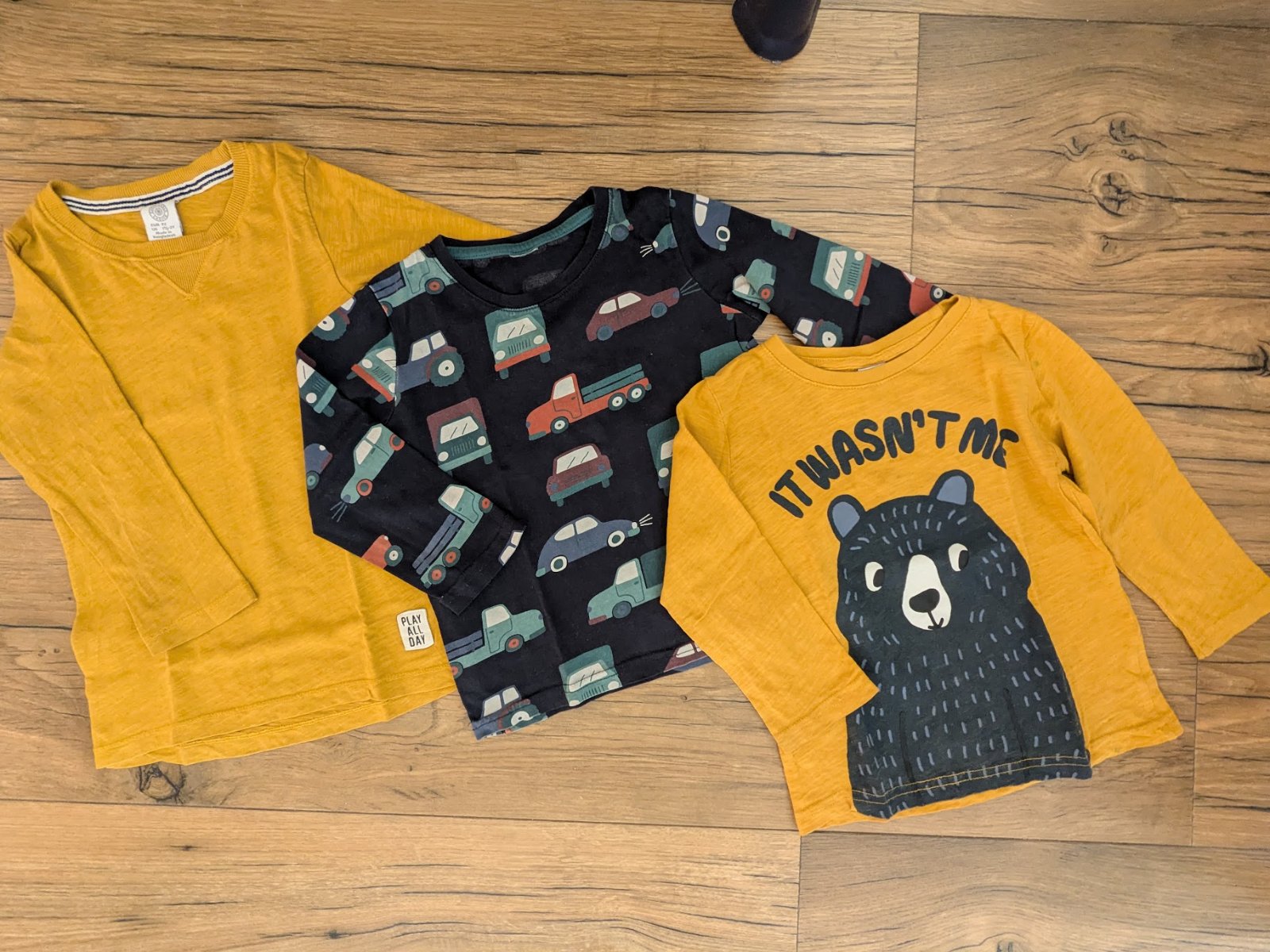 Tričká - autíčkové bez poškodení, s mackom má fliačik, aj horčicové, inak sú OK, pridávam ich zdarma.